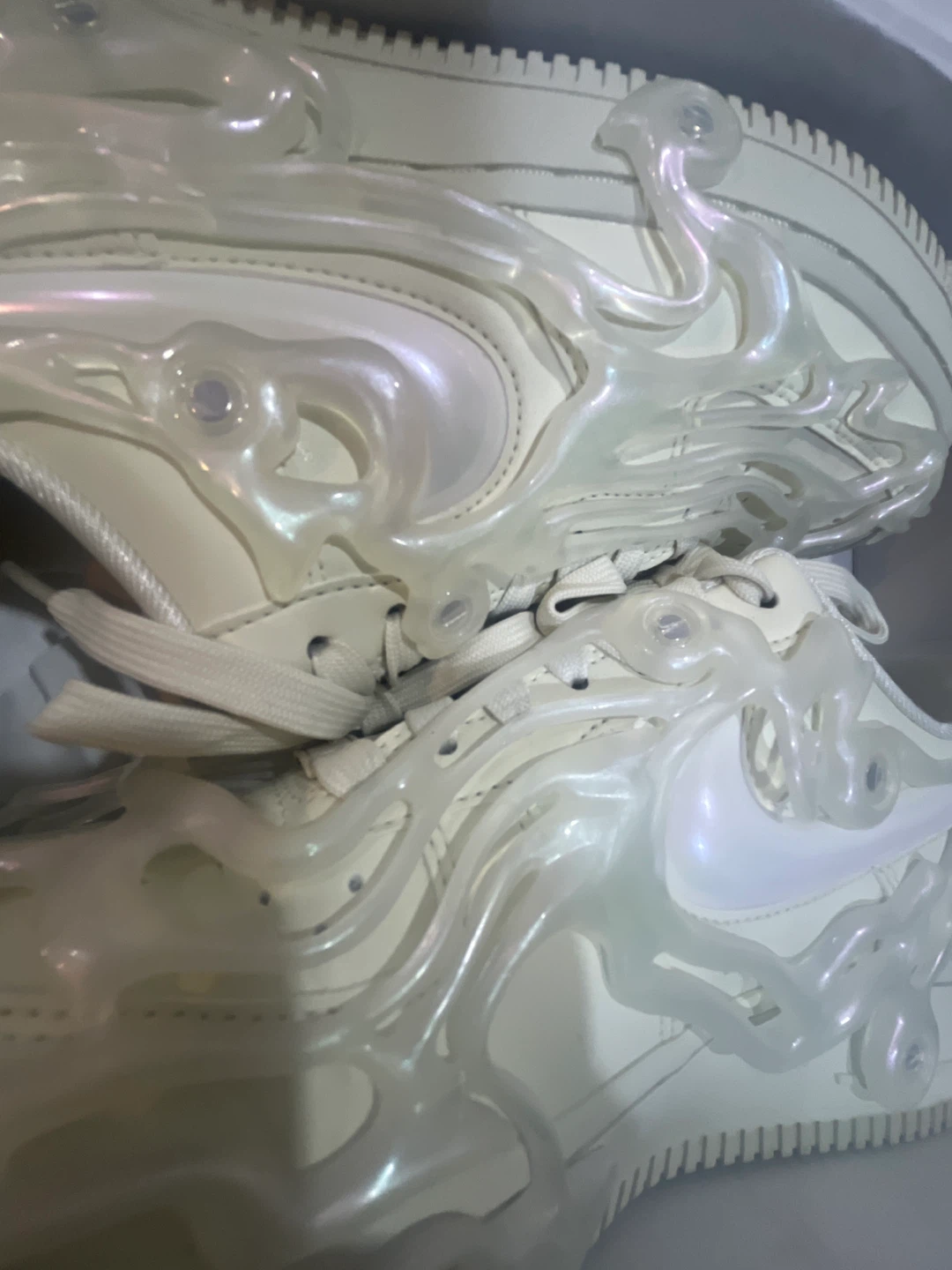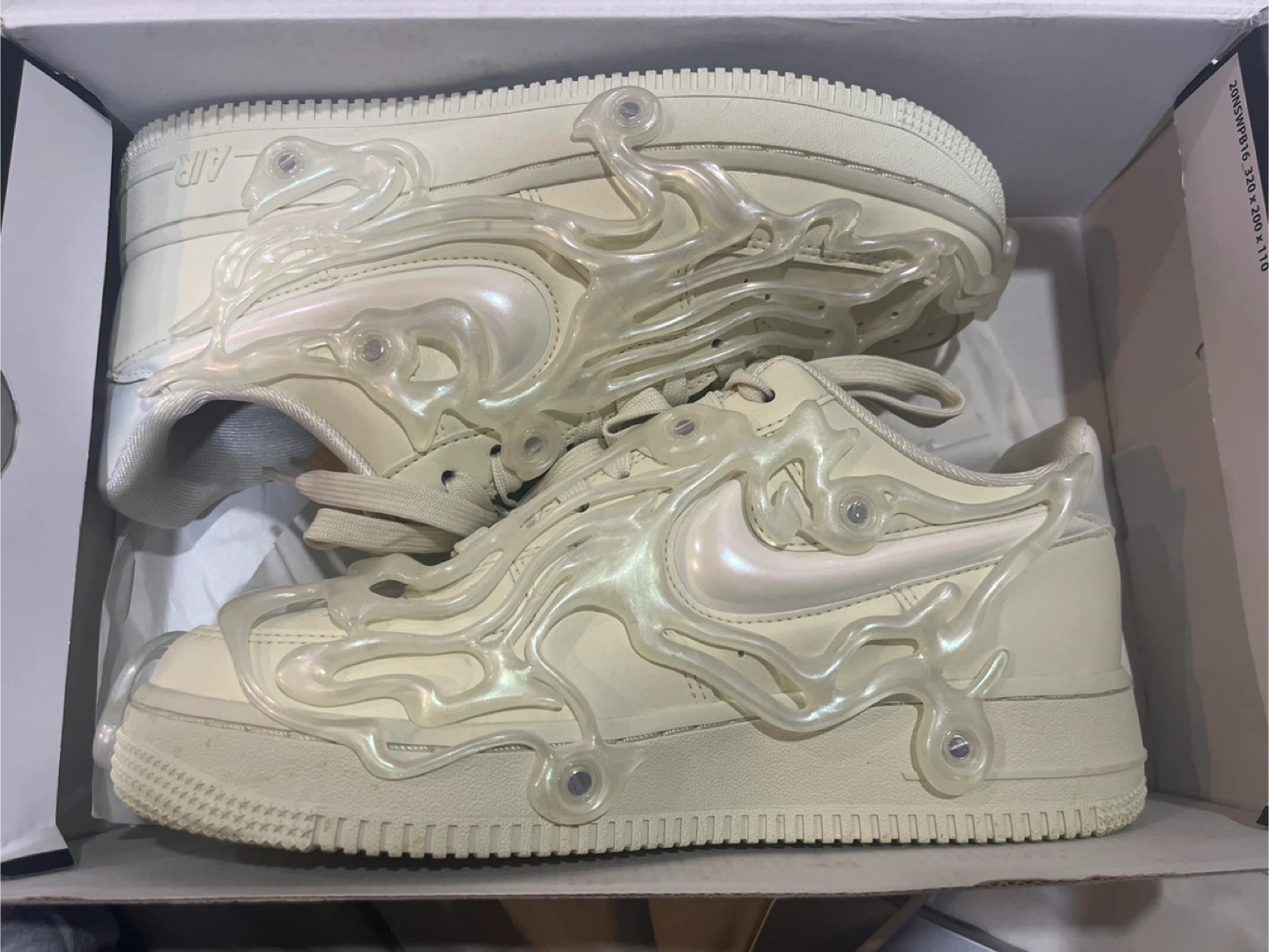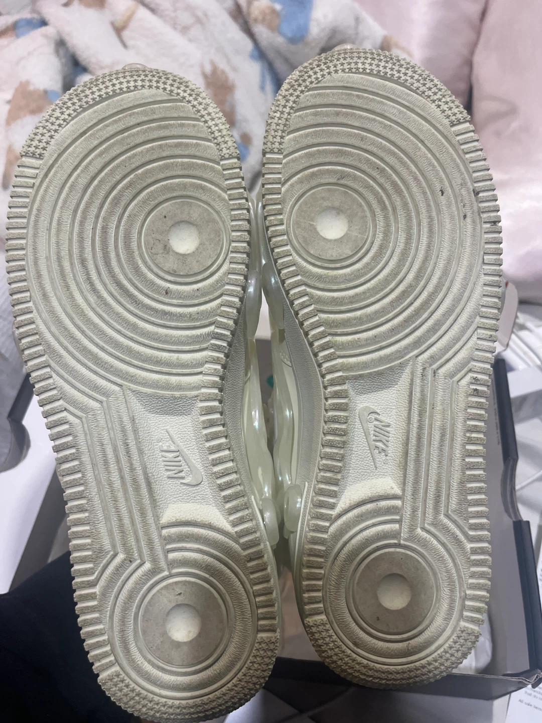 Authentic Nike Sea Glass Air force 1s originally bought for $180 , worn once. I’m selling these because I’m matching with a friend but we don’t talk to each other anymore. Comes with the box and extra tabs in case you loose any. Because the shiny rubber on top is removable if wanted. Bottoms are not stained I’m just lazy and don’t wanna scrub them .😓