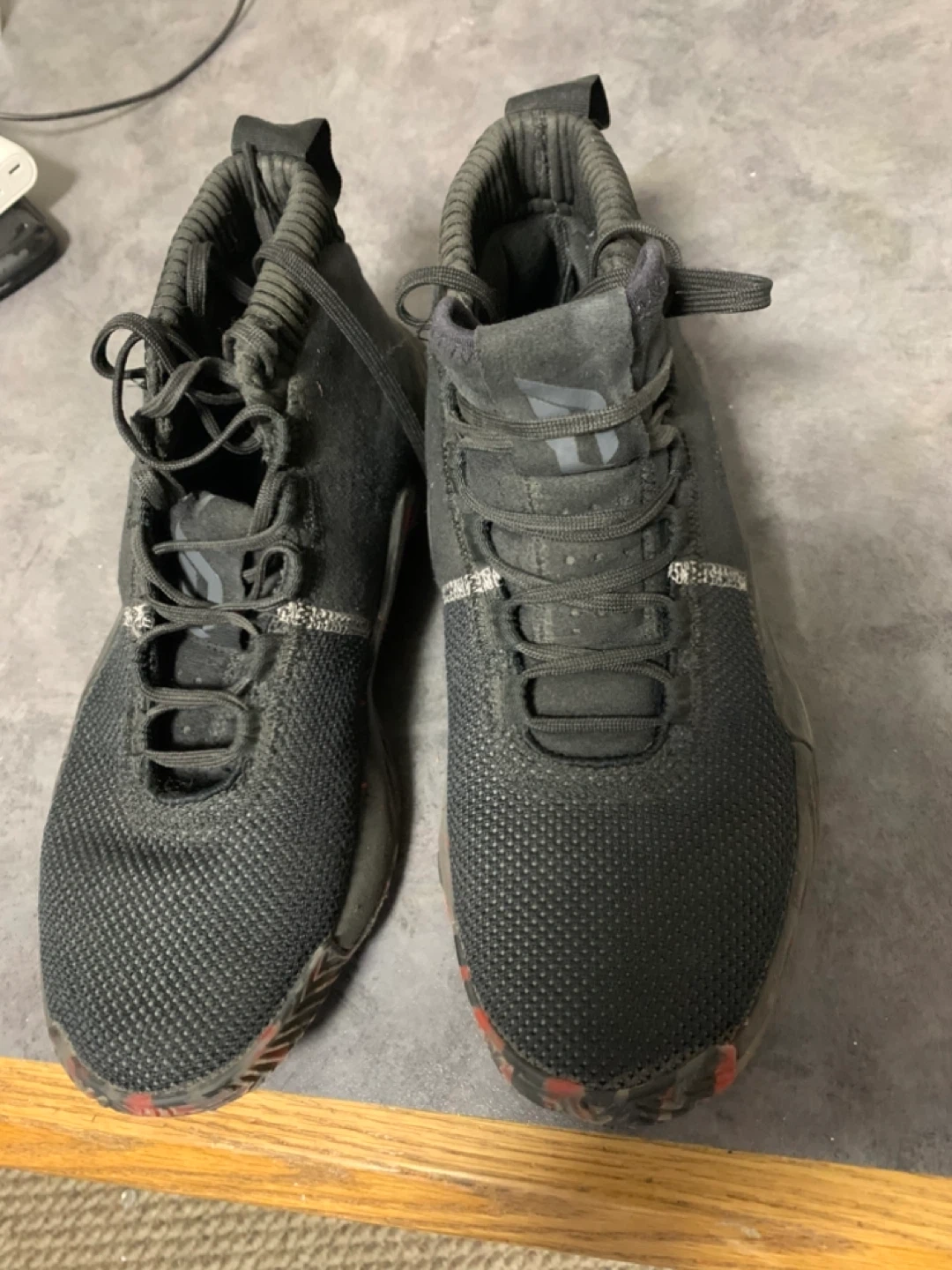 Adidas Dame 5 basketball shoes in size US 8. They are black with red detailing. The shoes are in good condition, as shown in the pictures. "People's Champ" is written on the back.size 8