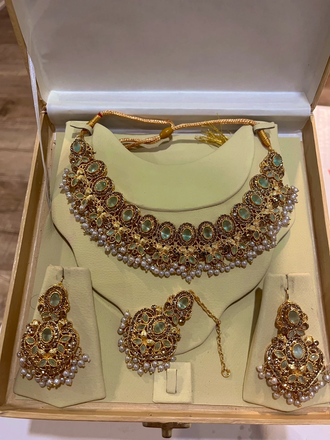 Selling a beautiful jewellery set that includes a necklace, earrings, and a tikka. The set is gold in colour and features intricate detailing with pastel bluish stones and small pearls.