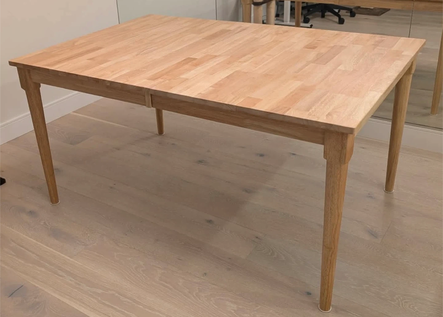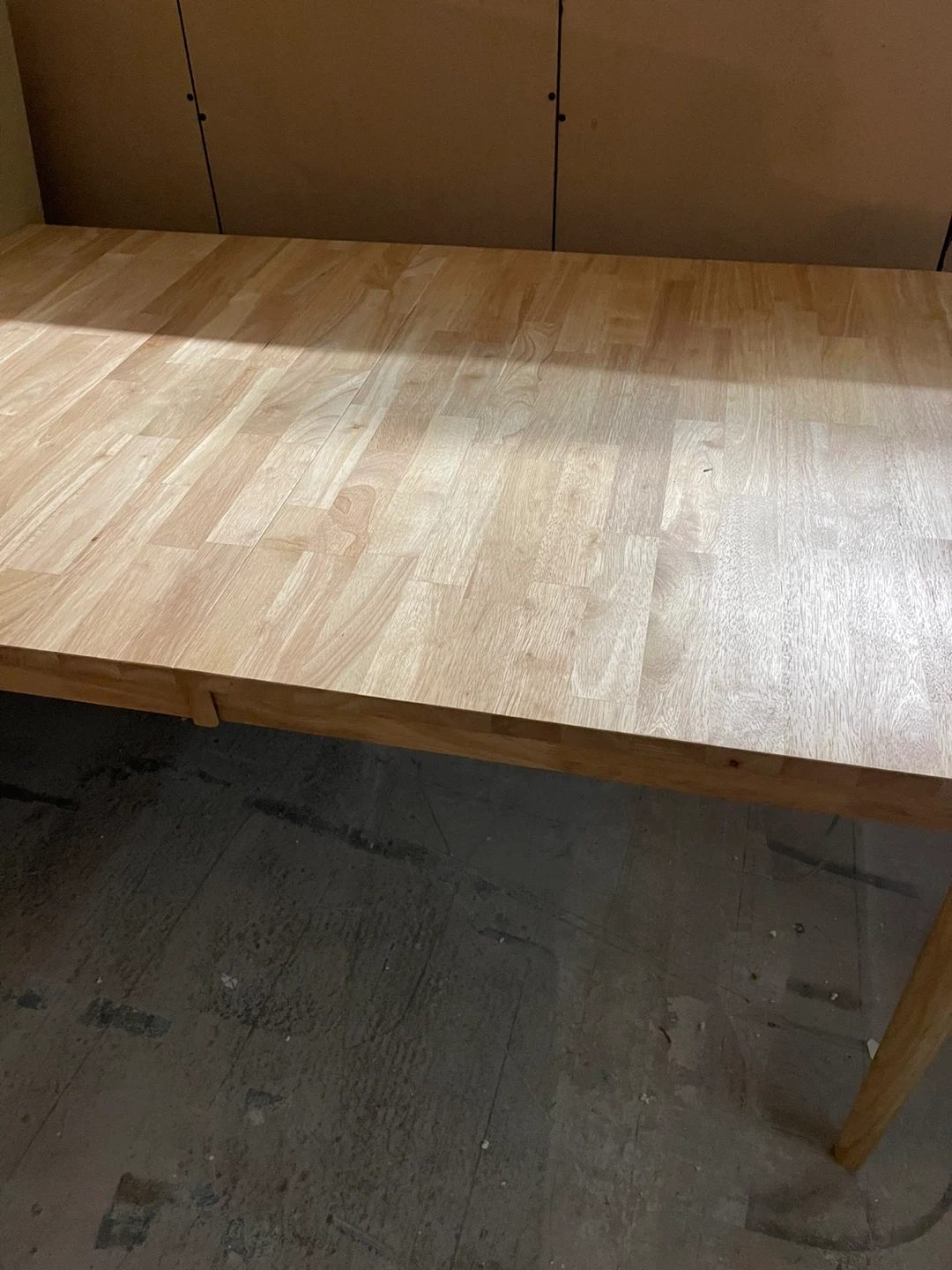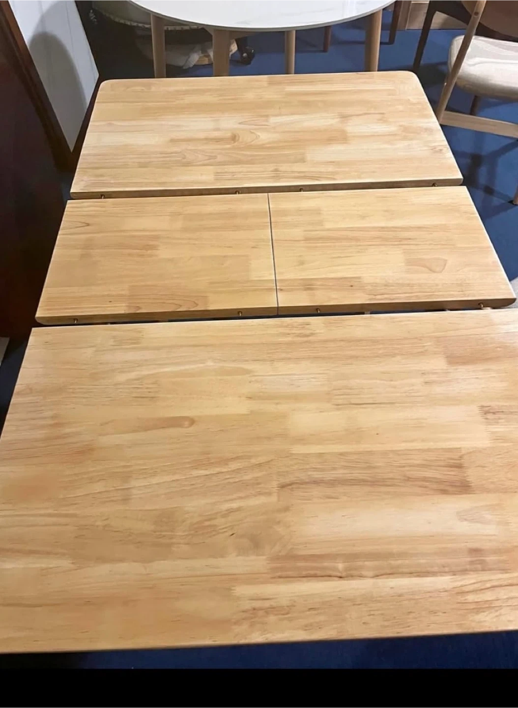 Selling a wooden dining table with an extendable feature! It's brand new “box packed. and perfect for family dinners or gatherings with friends. The light wood tone is neutral and will match any decor