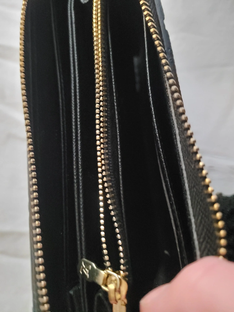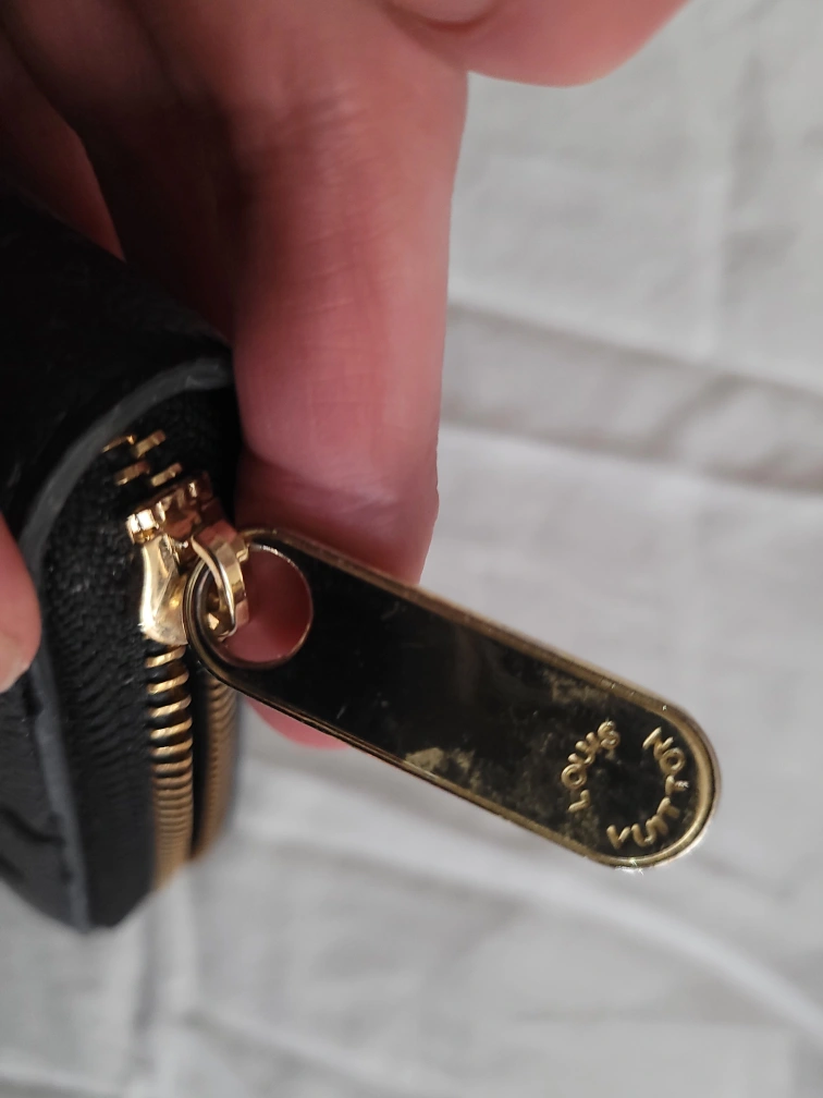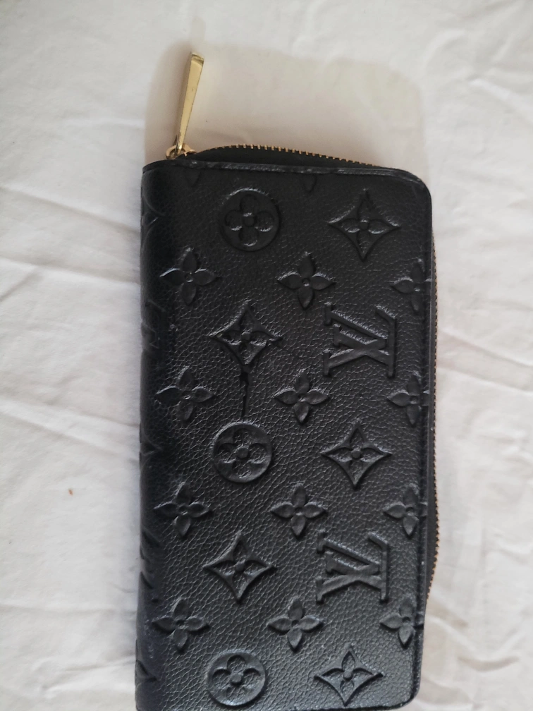 Selling a Louis Vuitton wallet in black leather. It's in great condition and has a gold zipper. Perfect for keeping your cards and cash organized!