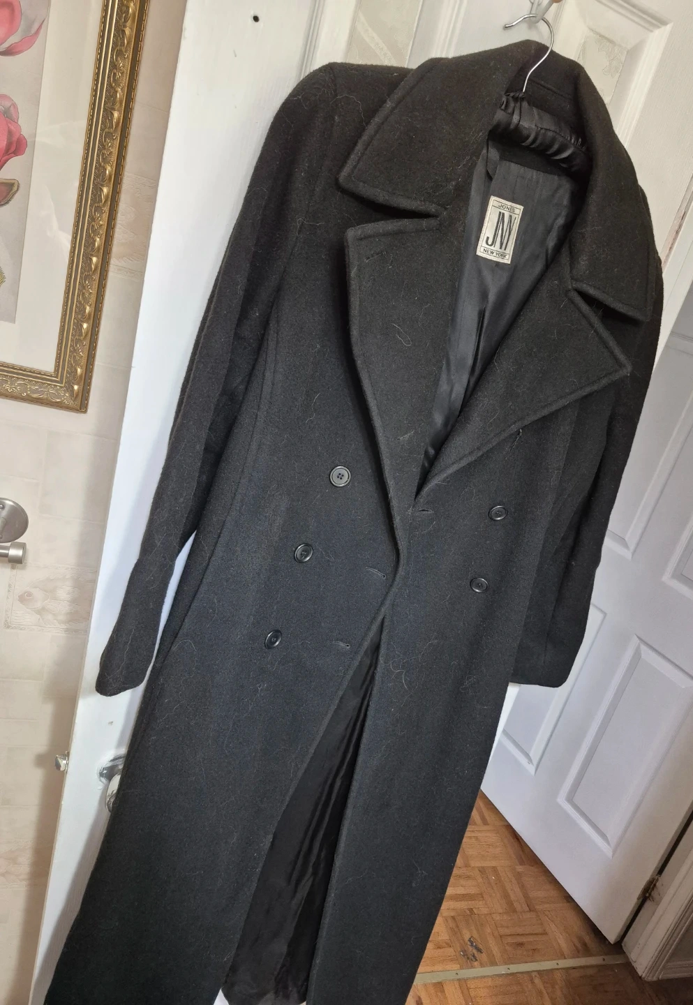 Selling a JNY Modern coat in black. It's a pure wool and has a classic double-breasted design. Perfect for staying warm this winter!