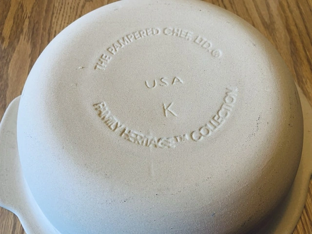 This is a Pampered Chef Family Heritage Collection stoneware bowl, perfect for baking and serving! This bowl is in great condition, never been used, just been sitting in my cupboard, doesn’t include a box.