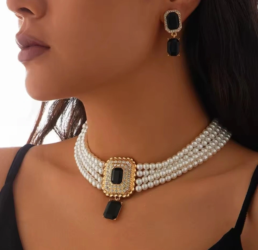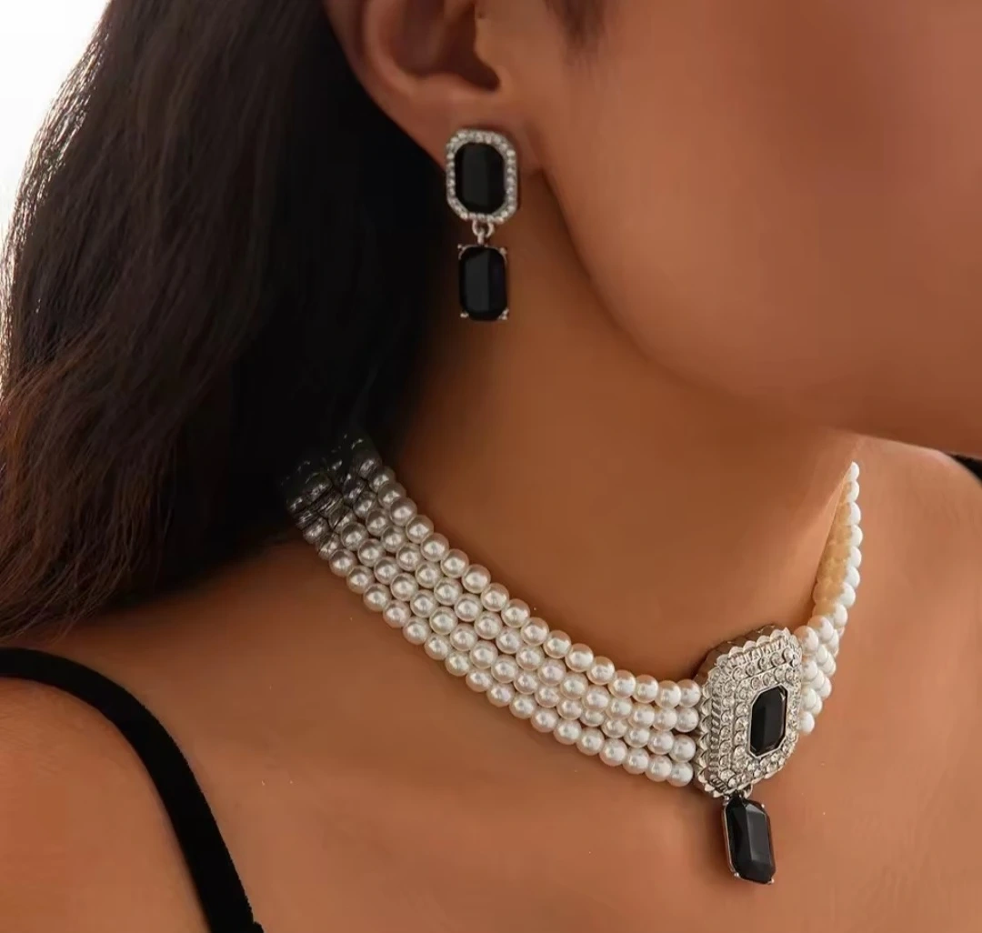 Pearl & Black Gemstone Necklace & Earrings Set