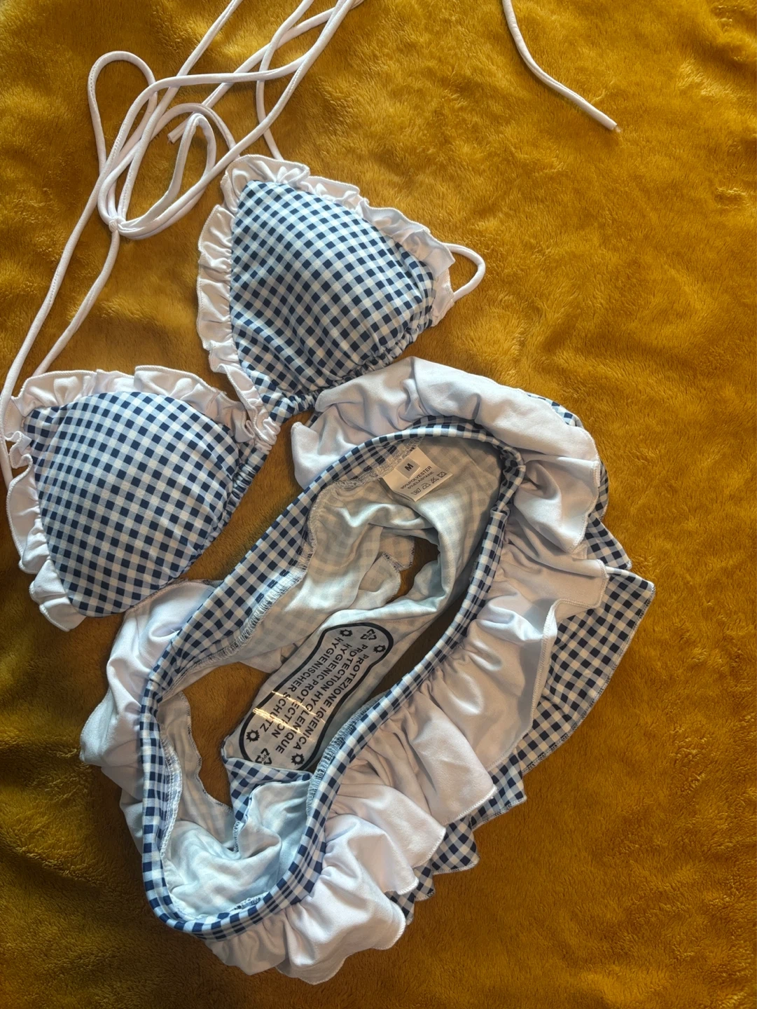 Cute blue gingham bikini set with white ruffled trim. Includes a tie-back halter top and matching ruffled bottoms. Size medium.