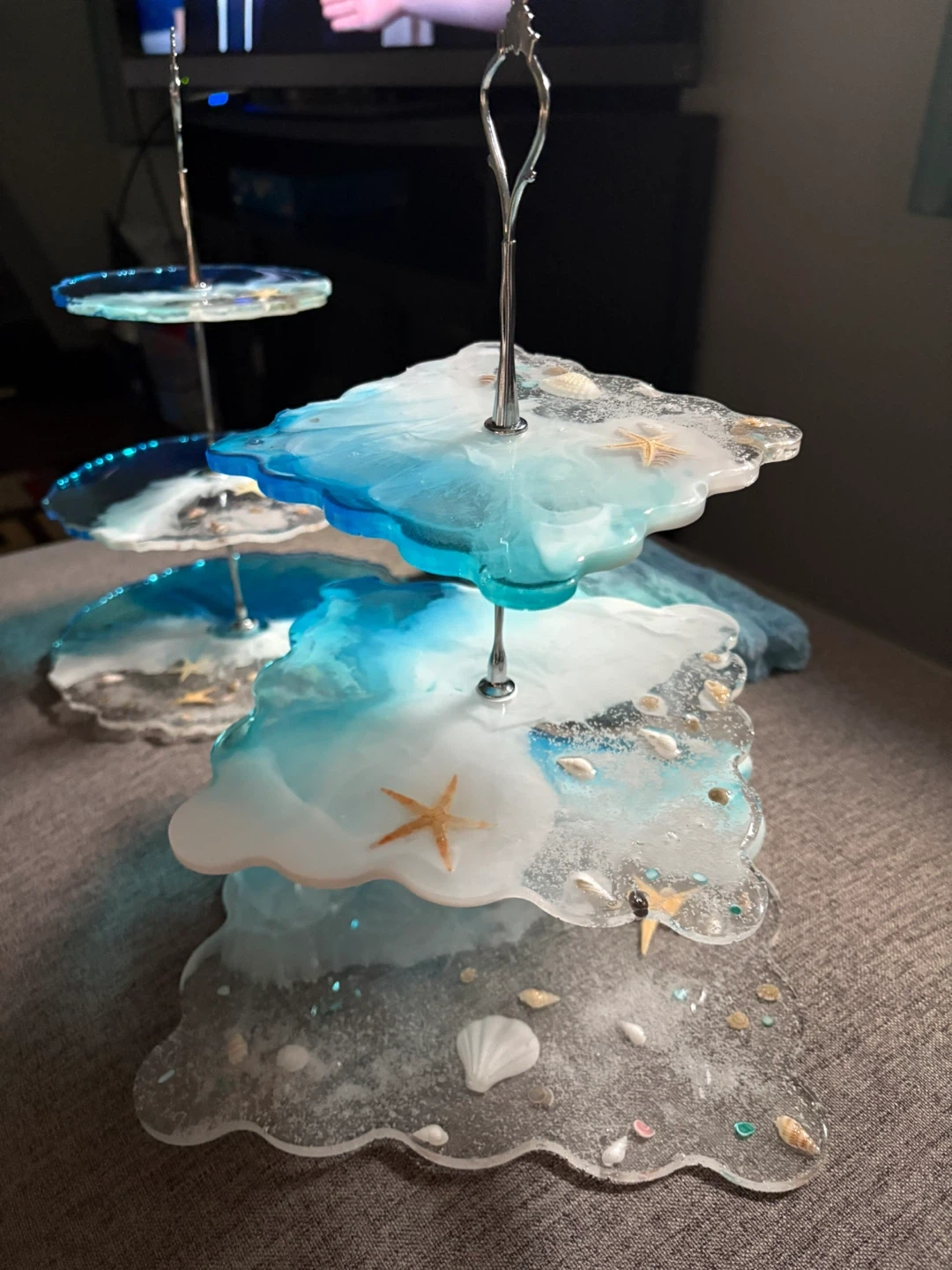 Beautiful ocean themed resin 3-tiered serving tray. It has a beachy vibe with starfish and shells embedded in the resin. Perfect for displaying desserts or appetizers!