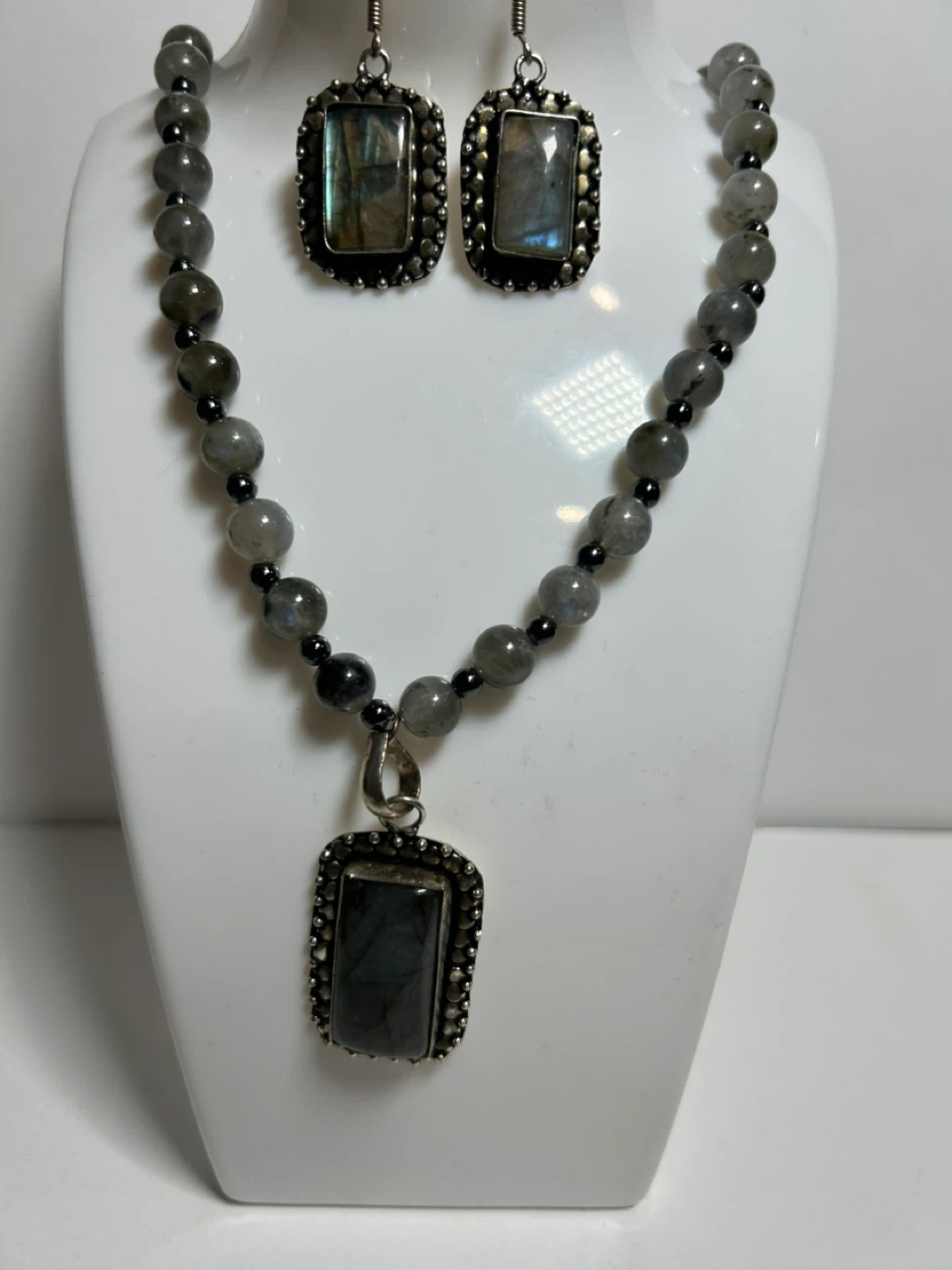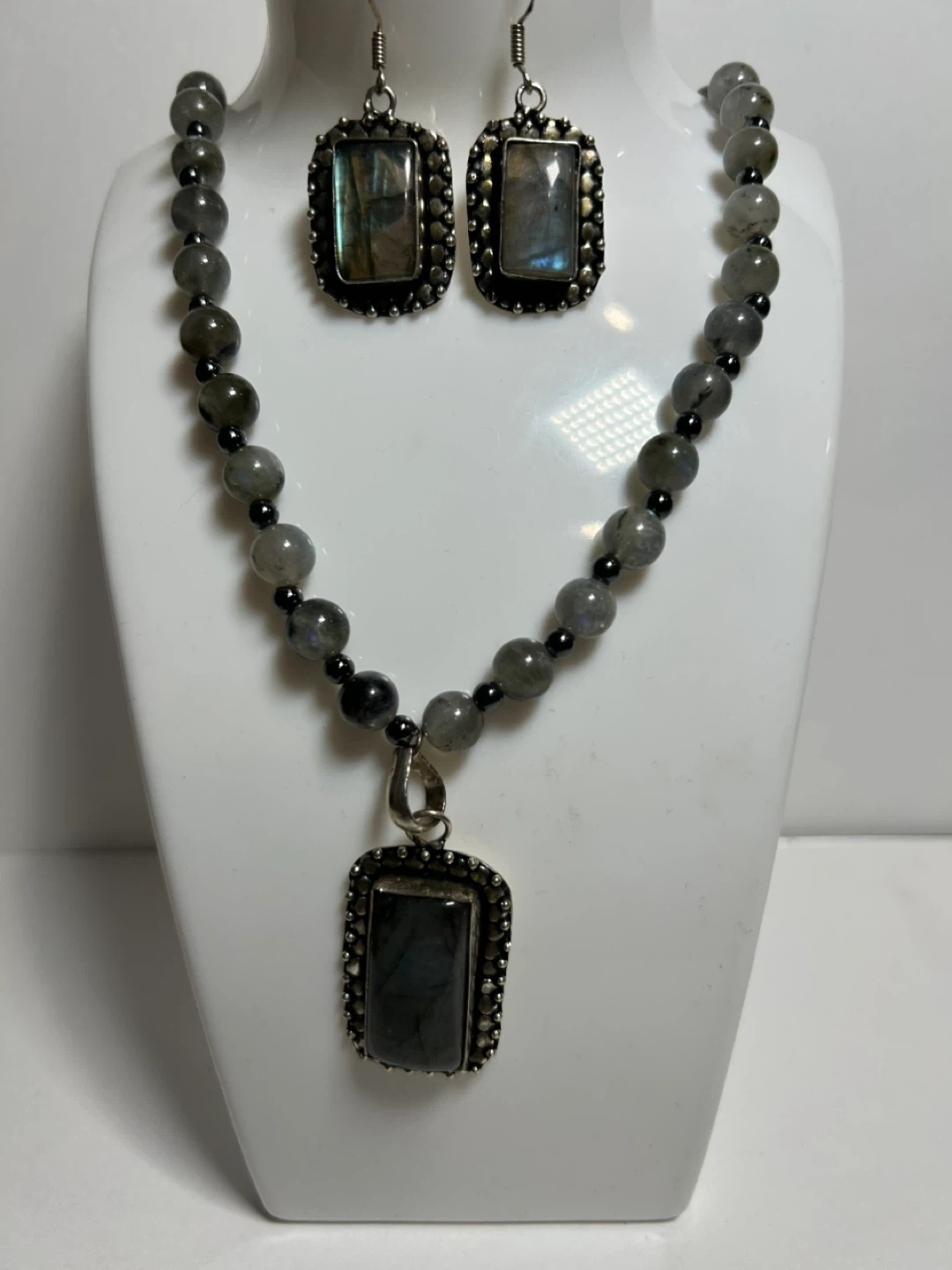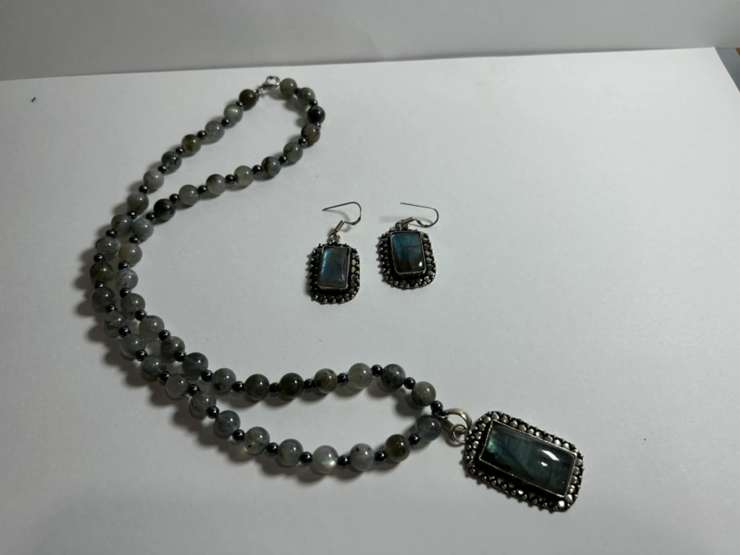 This is a lovely set featuring a labradorite necklace and matching earrings. The stones have a beautiful shimmer, and the set is in great condition. Perfect for adding a touch of elegance to any outfit!