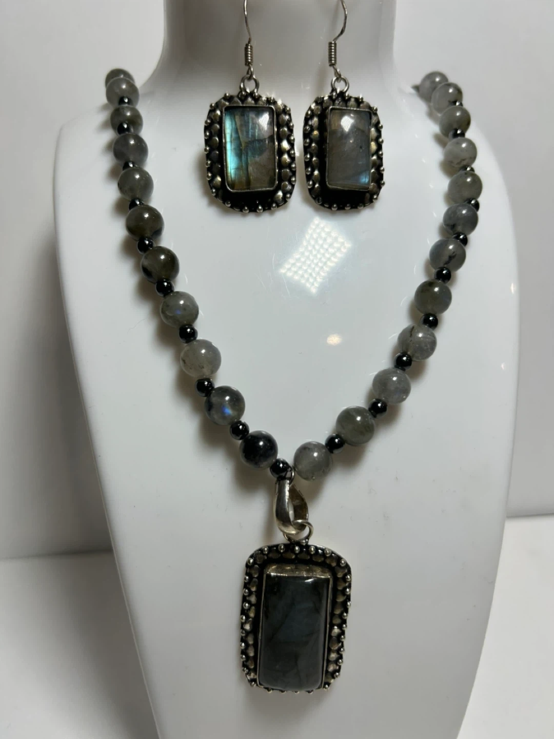 This is a lovely set featuring a labradorite necklace and matching earrings. The stones have a beautiful shimmer, and the set is in great condition. Perfect for adding a touch of elegance to any outfit!