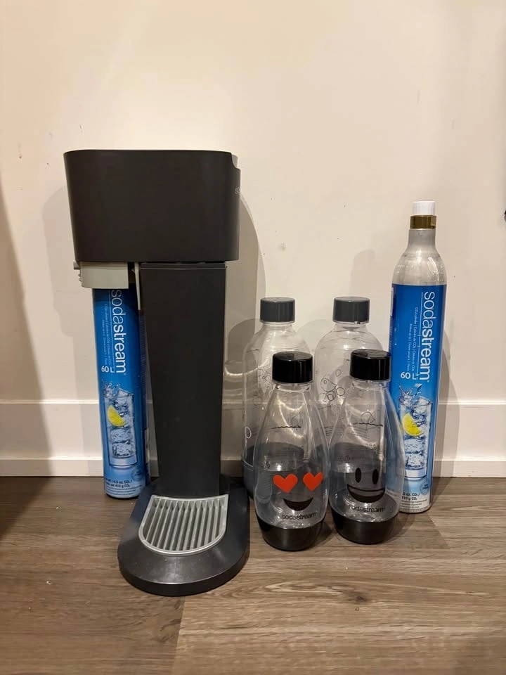 Complete Sodastream Set with x2 CO2 cylinders, x2 1L bottles, and x2 0.5L bottles.