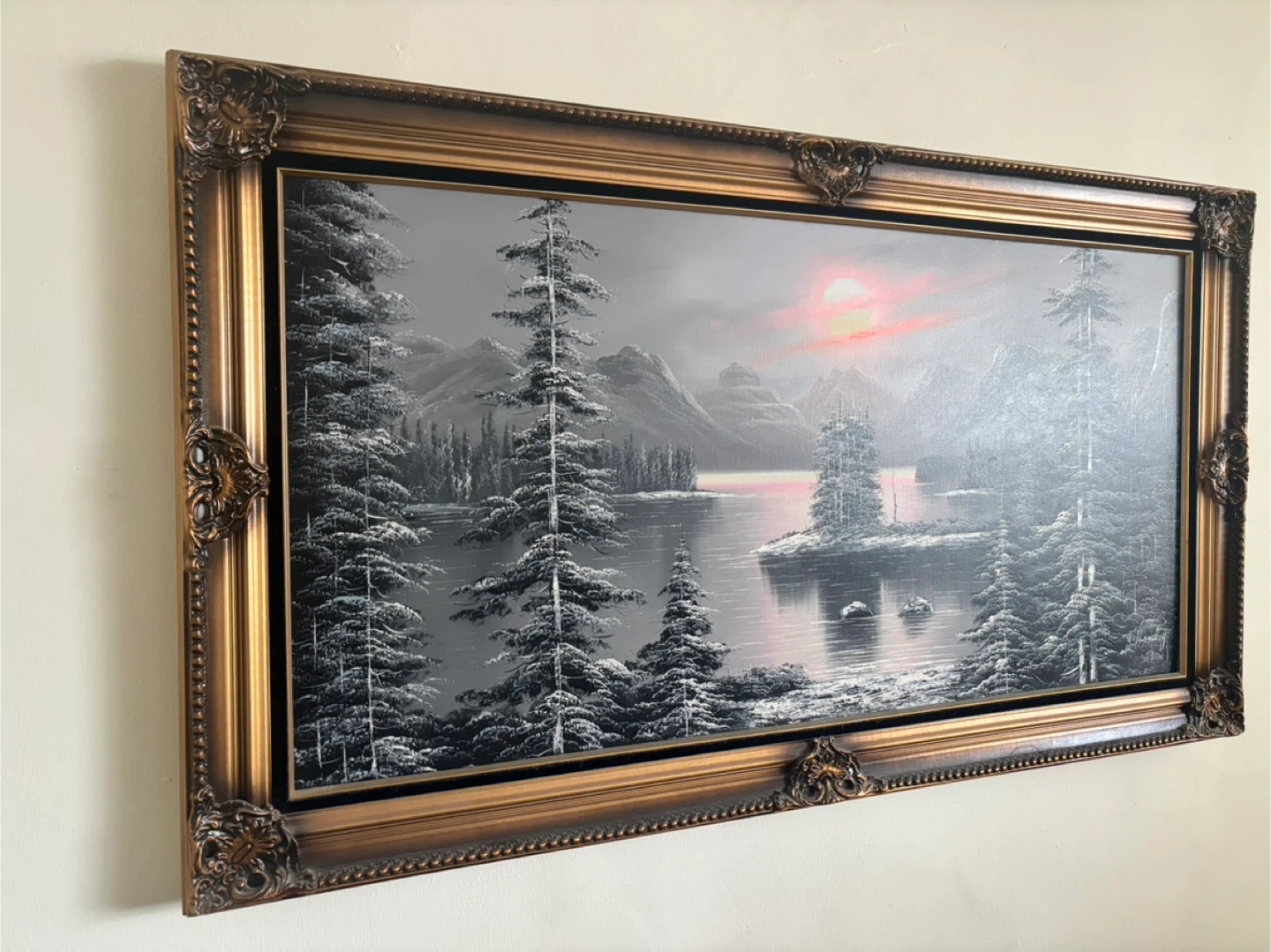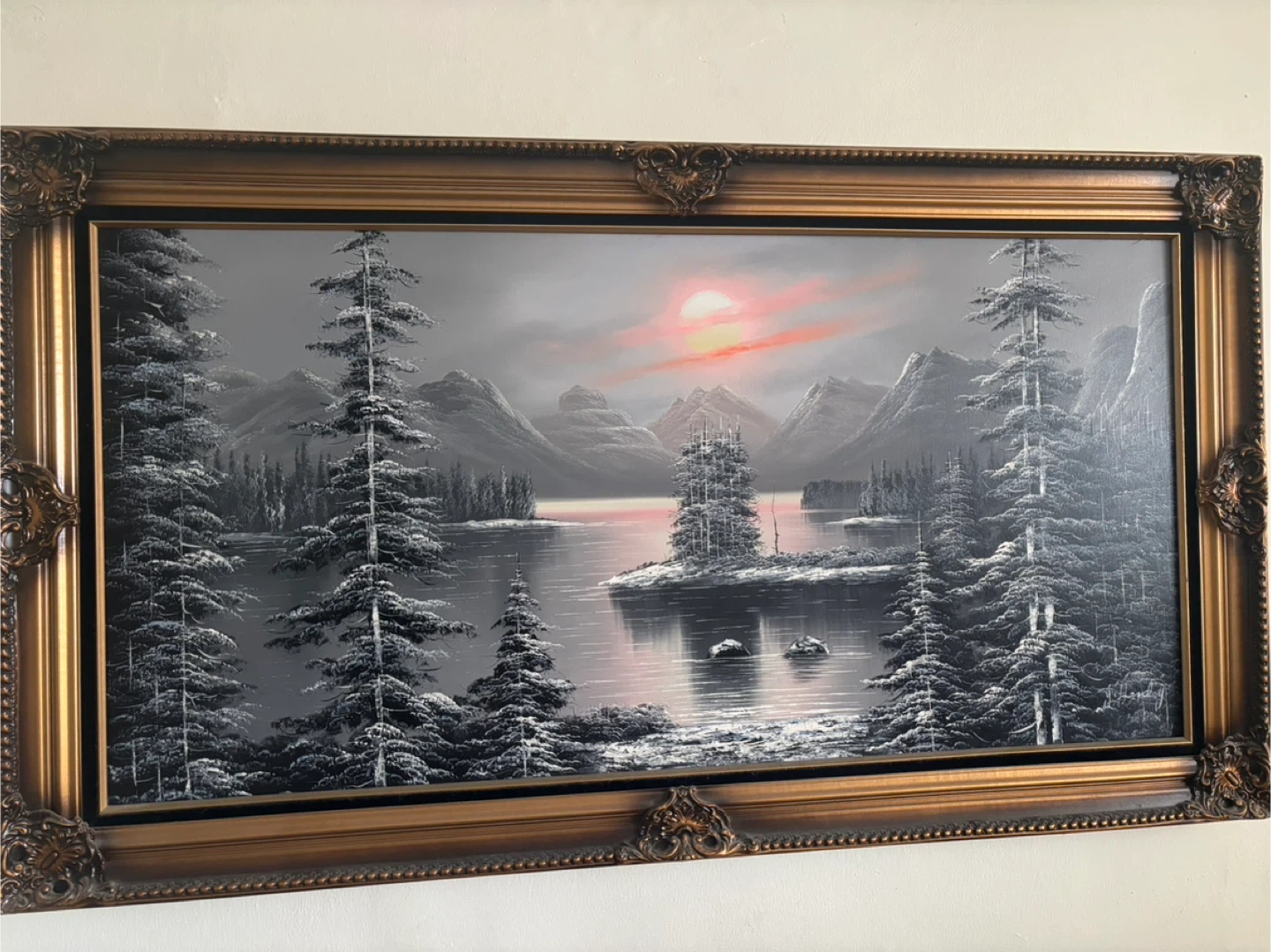 Original painting Depicts a snowy winter scene with a lake And snowy trees and mountains in the background. Signed in the bottom Right corner.