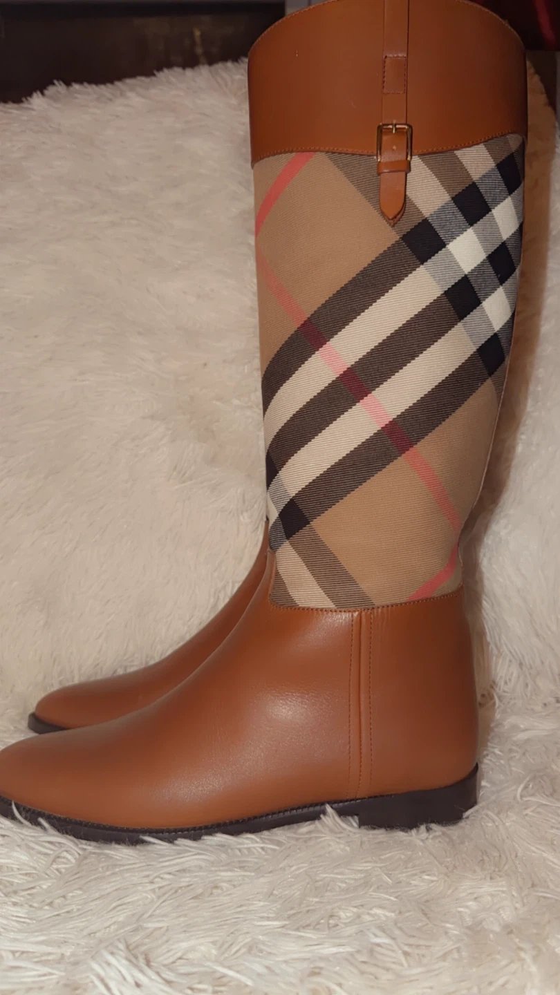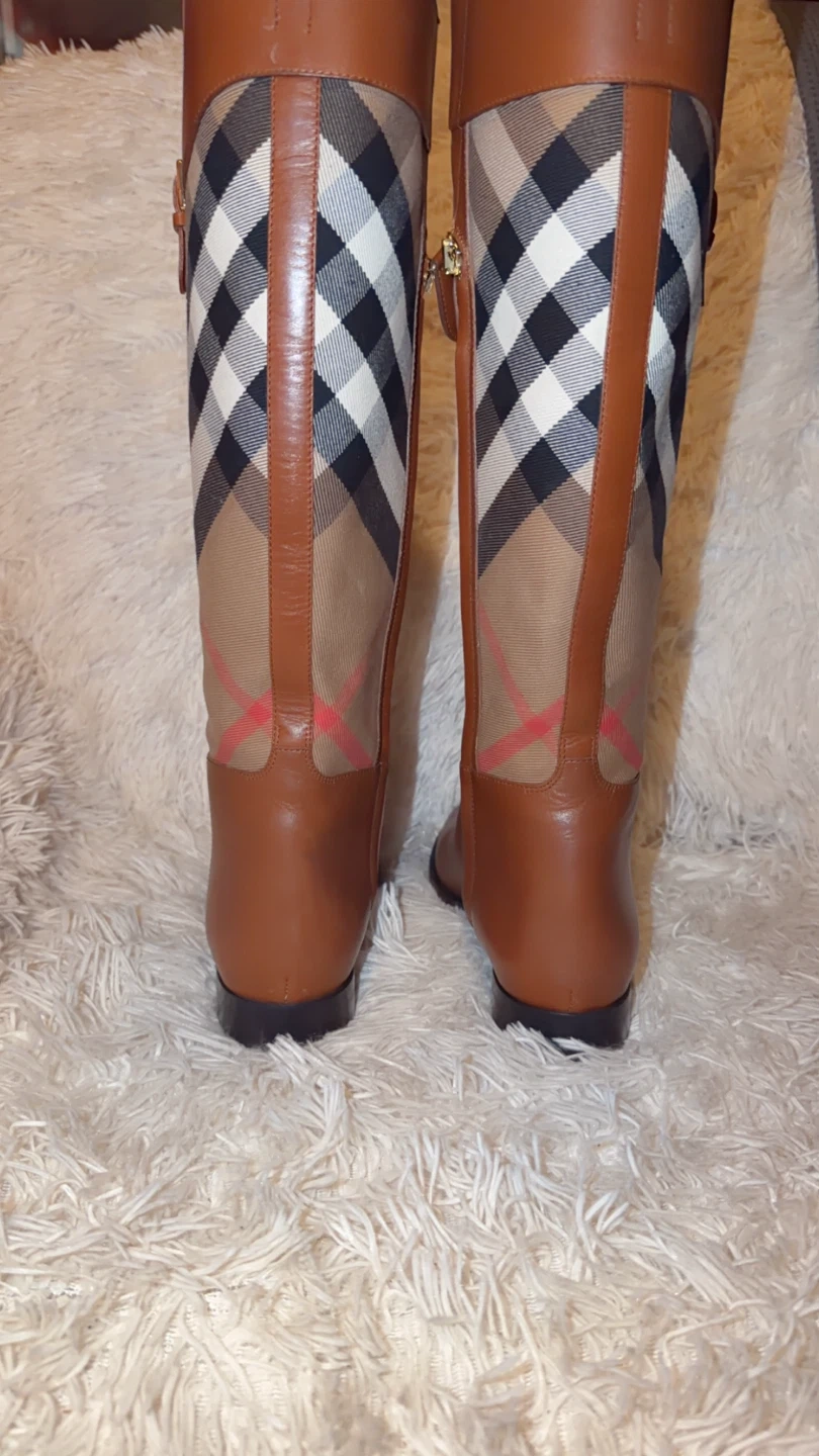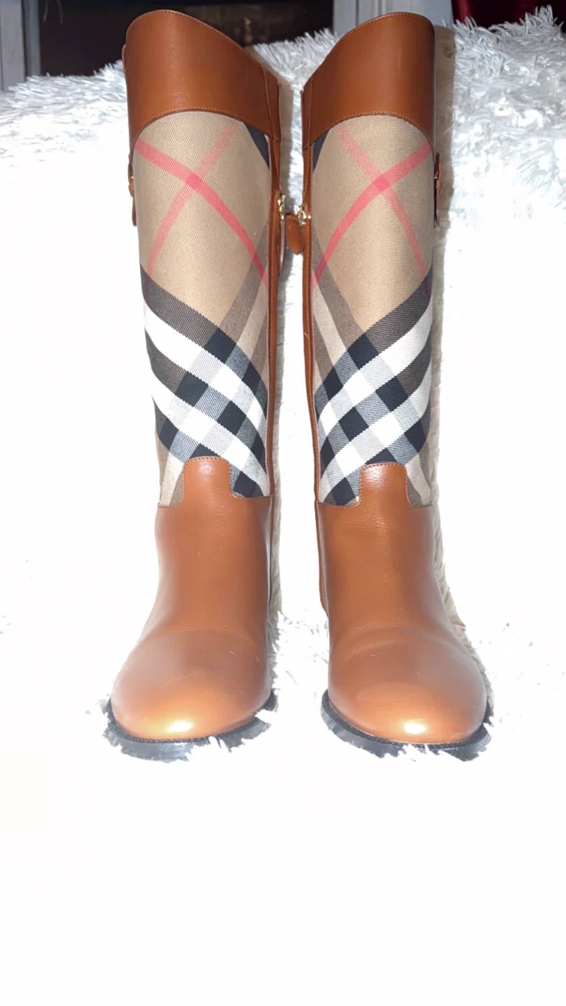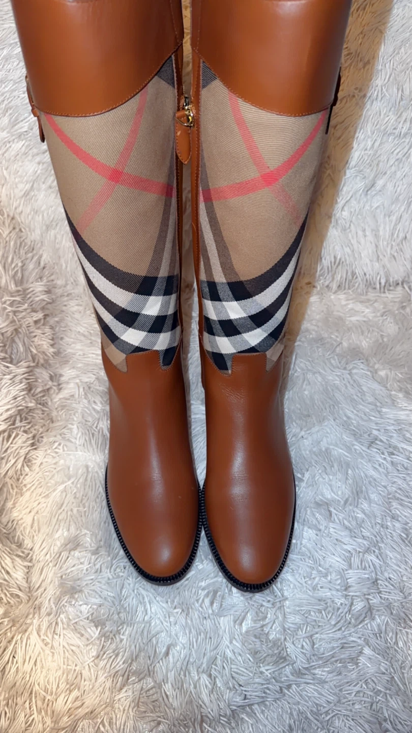 These stylish Burberry knee-high boots feature a classic design with brown leather and the iconic Burberry check pattern. Perfect for adding a touch of sophistication to any outfit!