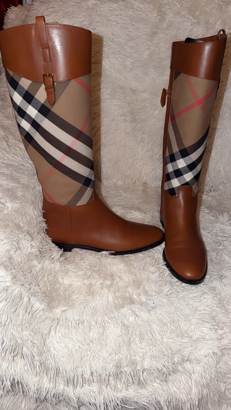 These stylish Burberry knee-high boots feature a classic design with brown leather and the iconic Burberry check pattern. Perfect for adding a touch of sophistication to any outfit!