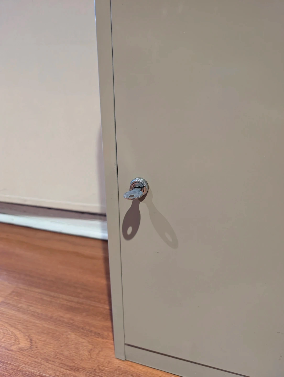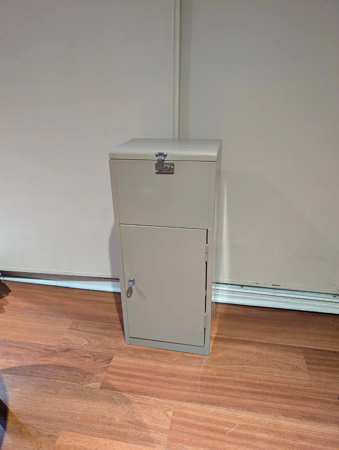 Good condition metal filing cabinet. Top compartment with two sections. Front compartment with two shelves. Top key missing (does not lock). Front door key included. Beige colour.