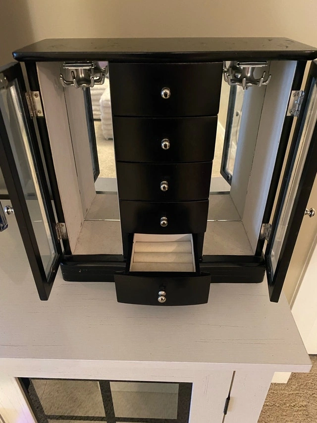 This black jewellery box is a stylish and practical storage solution for your precious items, featuring a sleek design with multiple drawers and side compartments to keep your jewellery organized and protected. Specifications: - Colour: Black - Compartments: Multiple drawers and side compartments with mirrors and doors. Just needs cleaned and has a bir of wear
