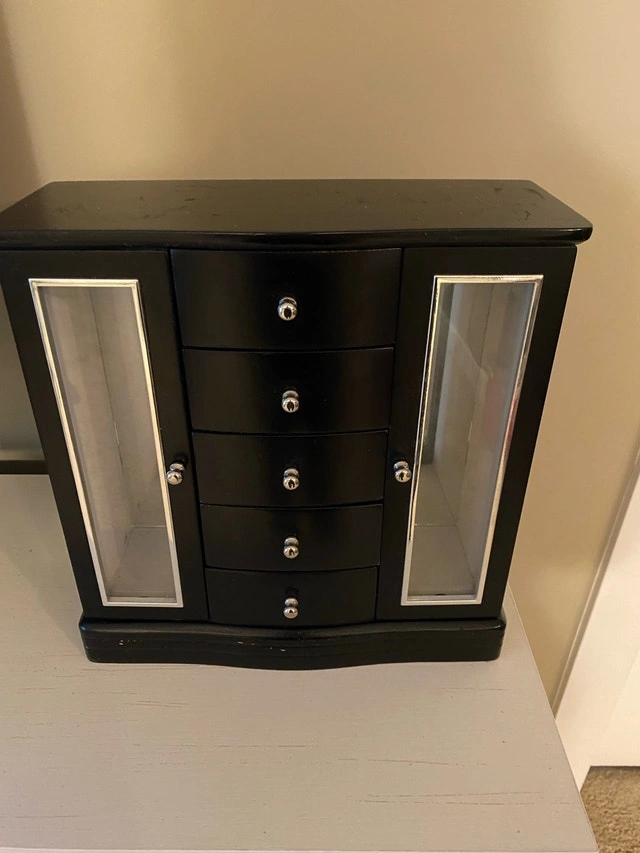 This black jewellery box is a stylish and practical storage solution for your precious items, featuring a sleek design with multiple drawers and side compartments to keep your jewellery organized and protected. Specifications: - Colour: Black - Compartments: Multiple drawers and side compartments with mirrors and doors. Just needs cleaned and has a bir of wear