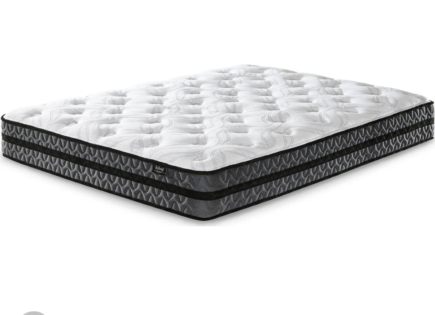 Selling a queen size mattress in great condition. It features a white top with a black and grey patterned border. Perfect for a good night's sleep!