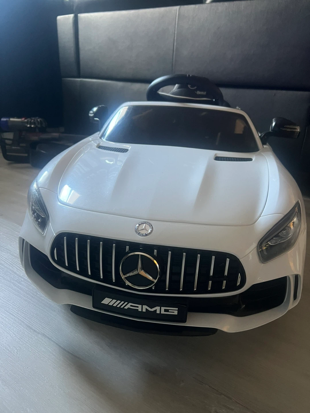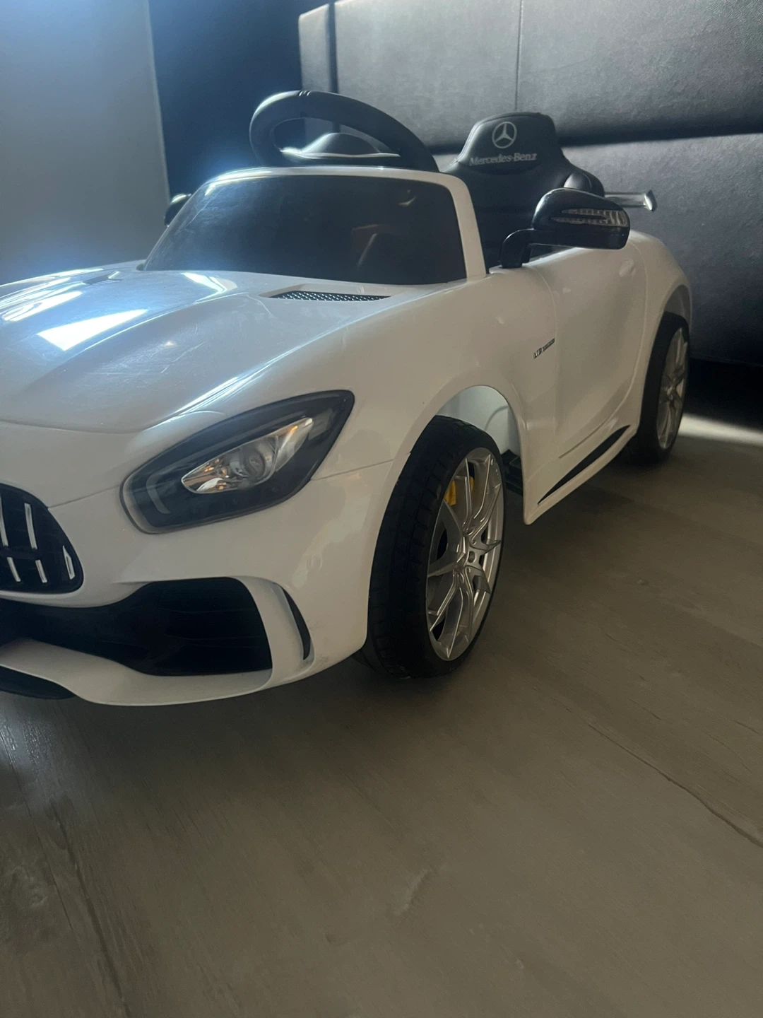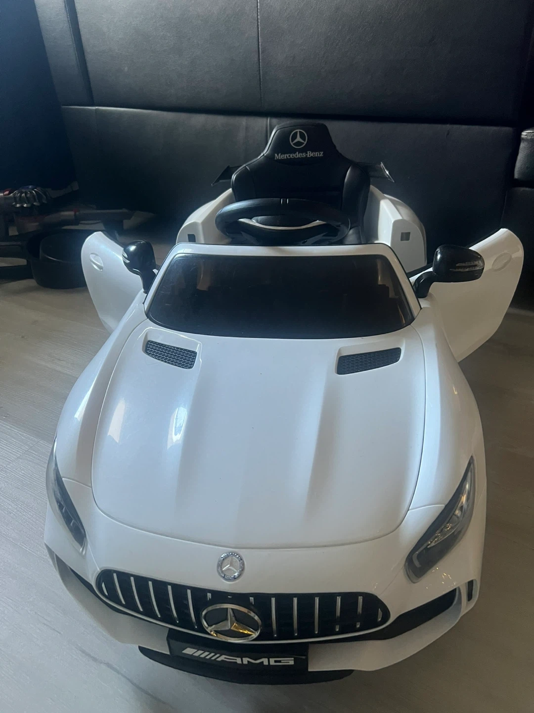Selling a Mercedes-Benz AMG GT ride-on car for kids! It's in great shape and ready for a new little driver. The car is white and features the iconic Mercedes-Benz logo. Awesome kids ride-on car in mint condition, barely used. Includes remote control so adults can drive, or switch to child-drive mode with 3 speed settings. Comes with charger. Originally $500 — asking only $250. Perfect Christmas gift and ready to go! Perfect for cruising around the neighbourhood!