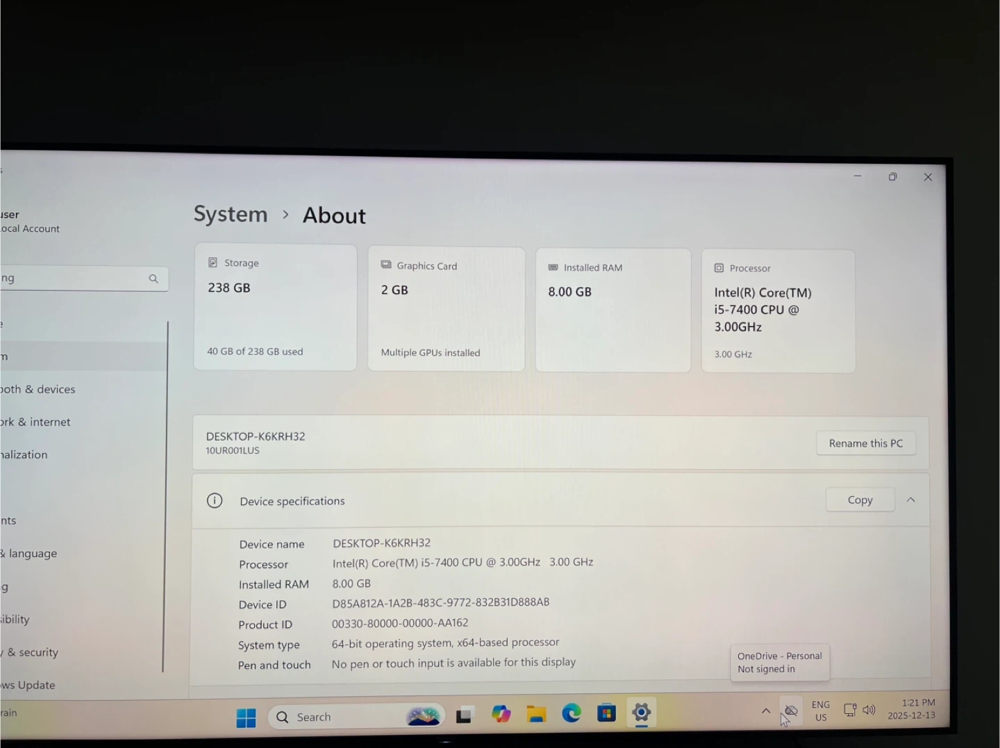 Selling a Lenovo ThinkCentre desktop PC. It has Windows 11 Pro installed, with 237 GB storage. The installed RAM is 8.00 GB and it has an Intel(R) Core(TM) i5-7400 CPU @ 3.00GHz processor.