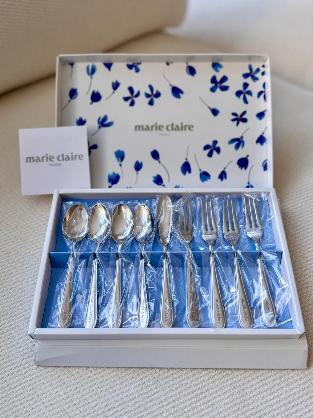 Selling a brand new Marie Claire Paris cutlery set, still in its original box! This set is perfect for adding a touch of elegance to your dining experience. The box is included, keeping everything neatly organized and ready for use