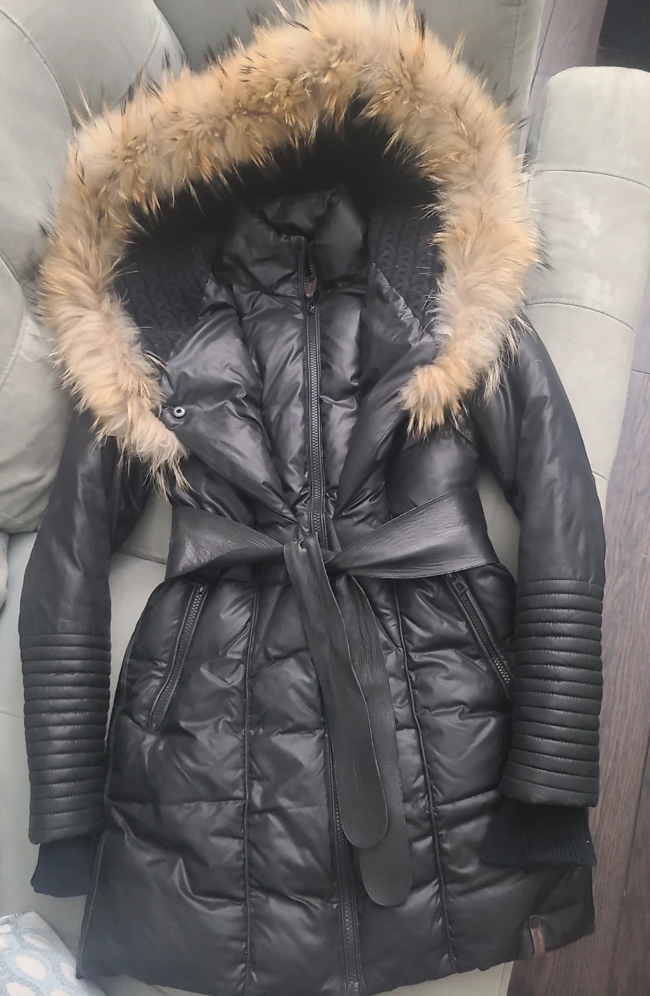 Selling my gorgeous Rudsak black down parka in XS. It features a luxurious fur-trimmed hood and a belted waist. Great for keeping warm during the winter months! Retails for $900, priced to go asking for $190.