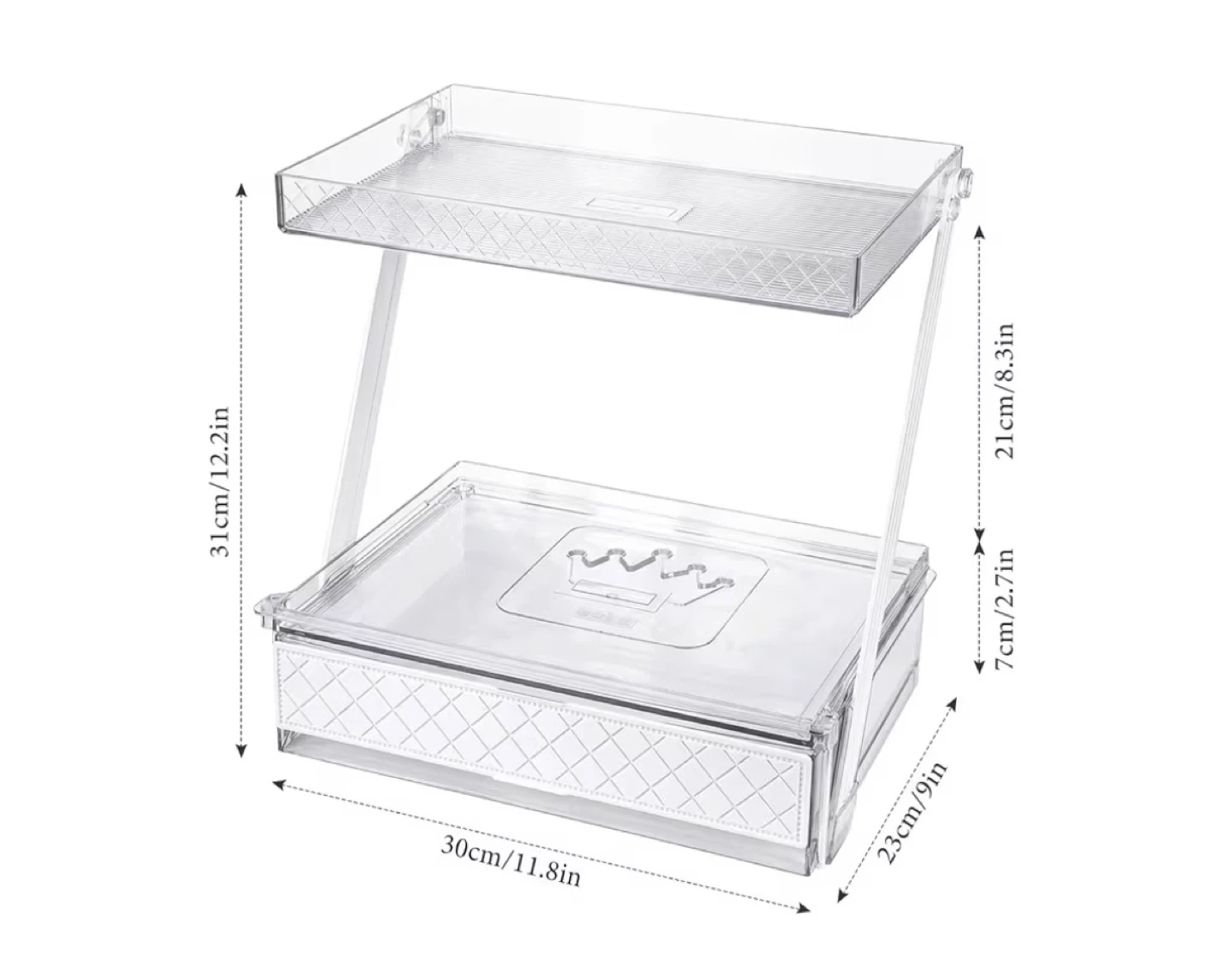 2-tier makeup/skincare organizer shelf. With a pull out drawer, pull out shelf and adjustable angle for top shelf. Basically brand new. Original price $45