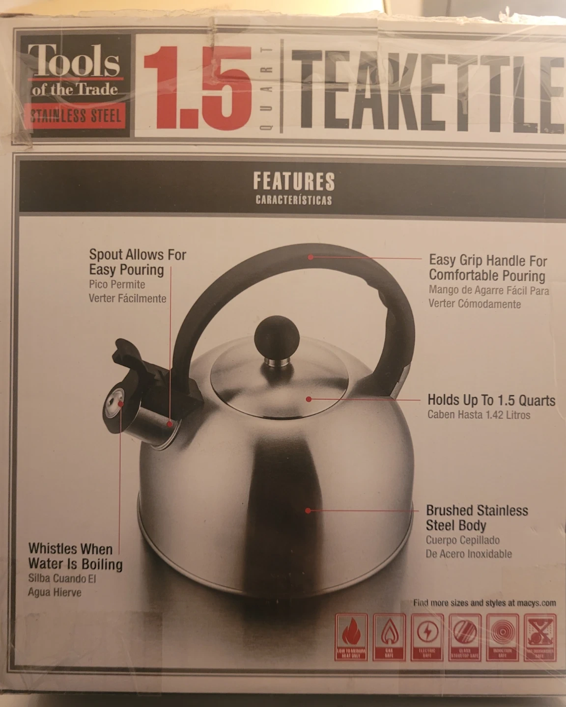 I'm selling a brand new Tools of the Trade 1.5 Quart Teakettle! It's made of stainless steel and has a brushed finish. The spout allows for easy pouring, and the handle is designed for a comfortable grip. Plus, it whistles when the water is boiling! The box is included