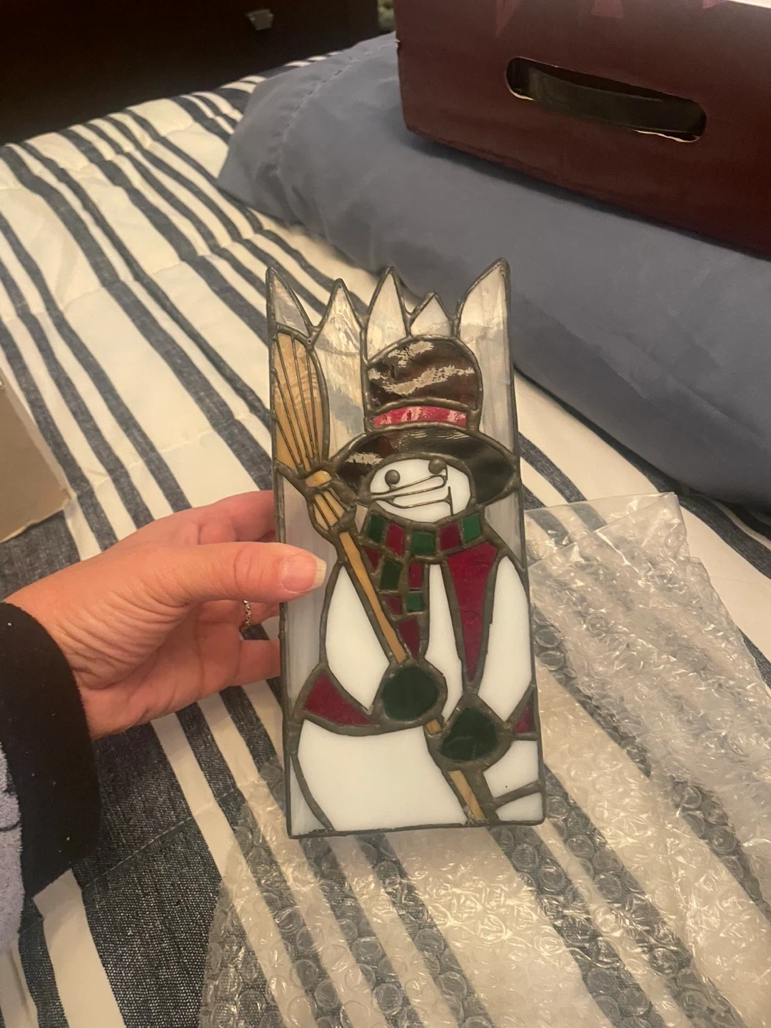 Here's a cute stained glass snowman decoration! It's in great condition and would be perfect for adding a touch of winter charm to your home. It features a snowman with a broom, wearing a hat and scarf. Put a candle inside and watch it glow