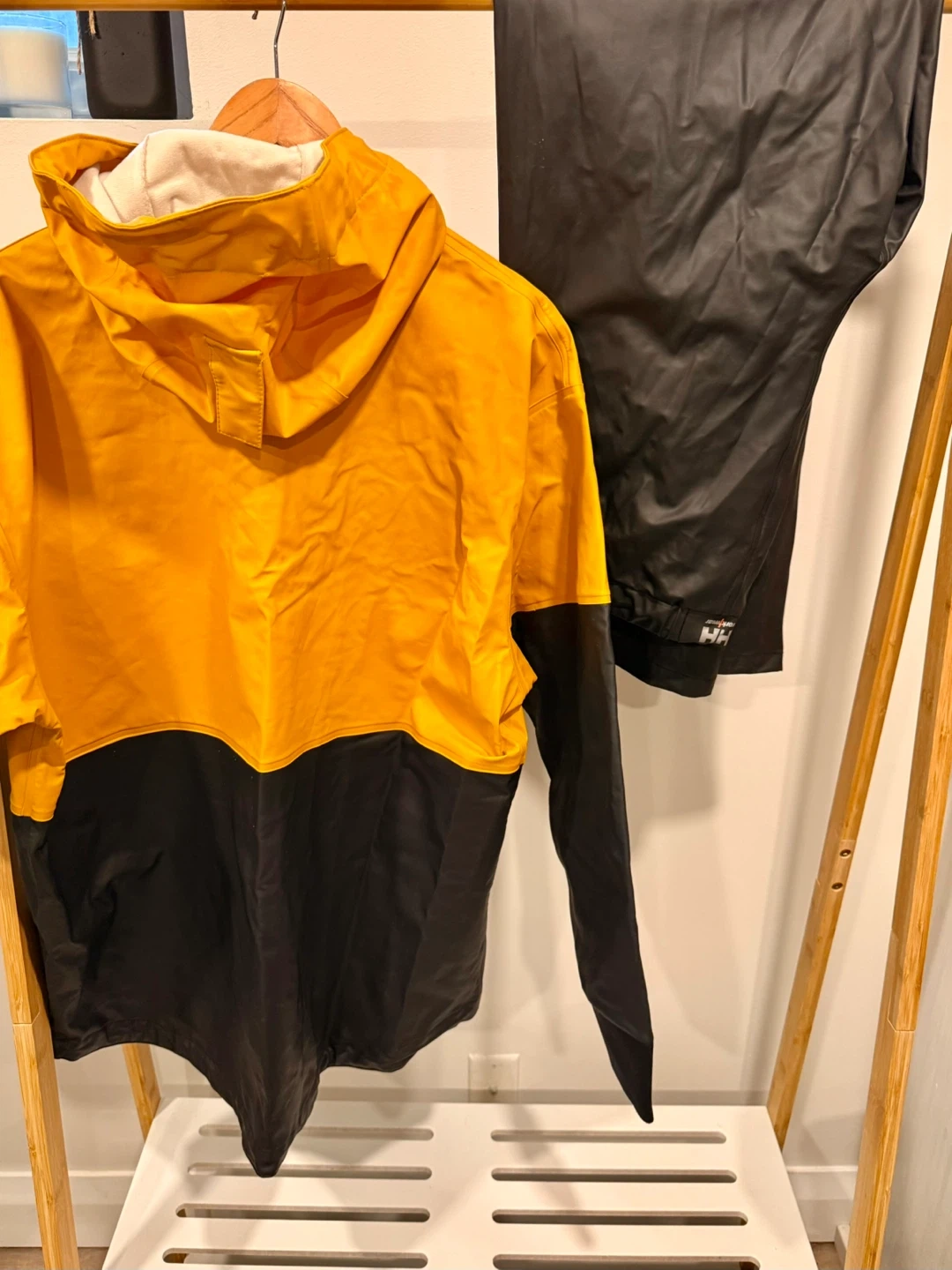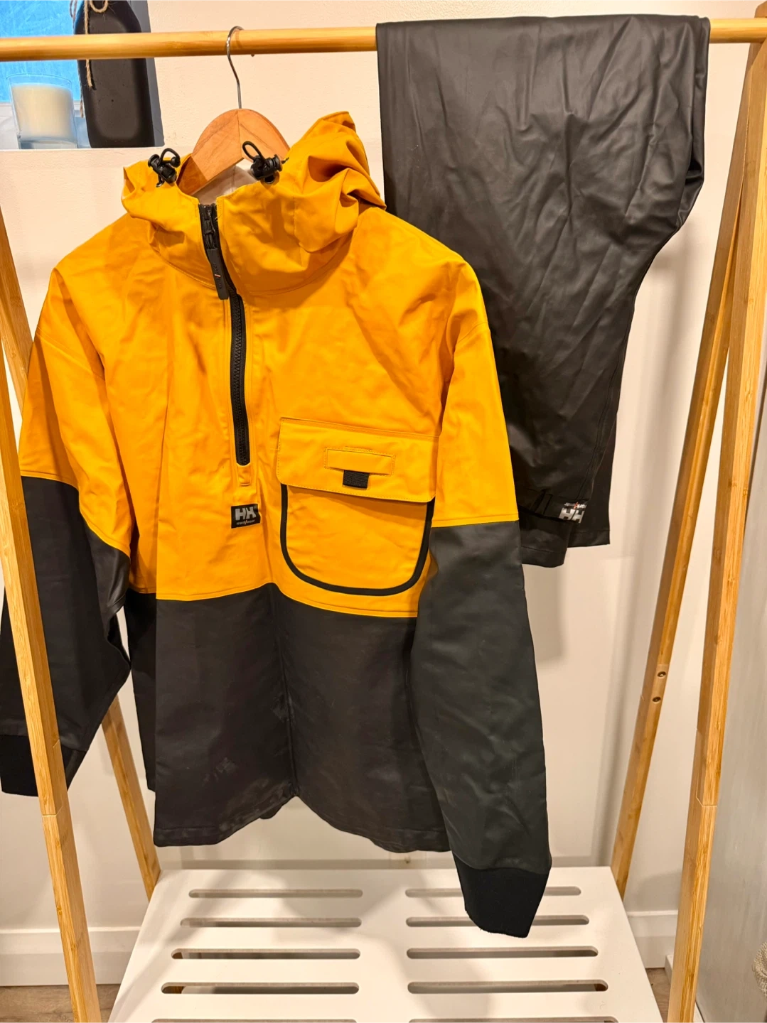 Selling a Helly Hansen work wear set, including a jacket and pants. The set is size large and features a yellow and black colour scheme. Perfect for outdoor work or activities!