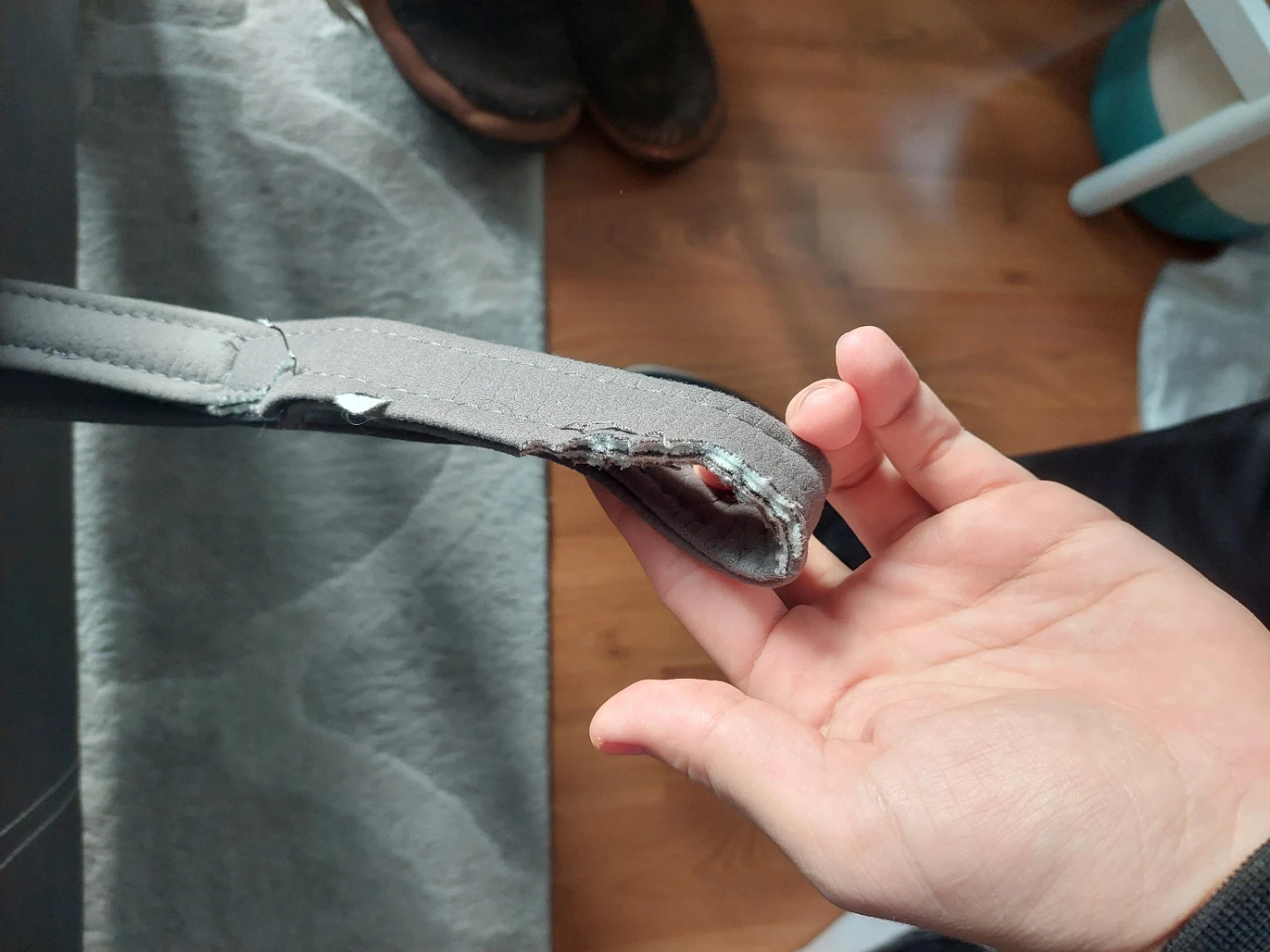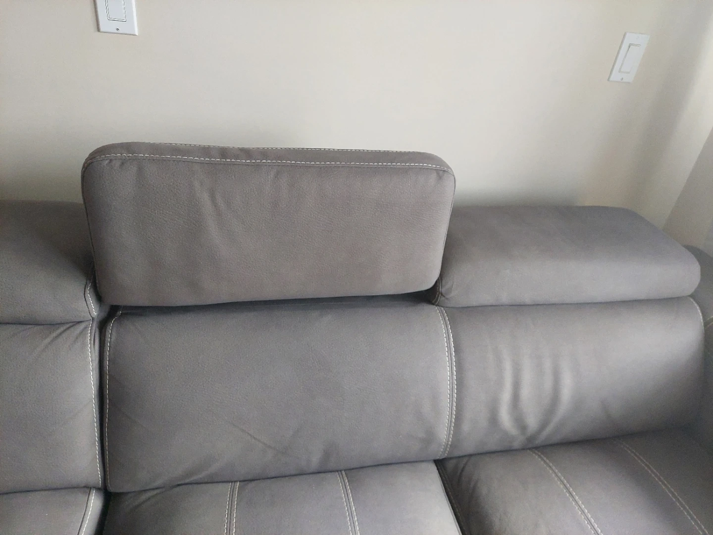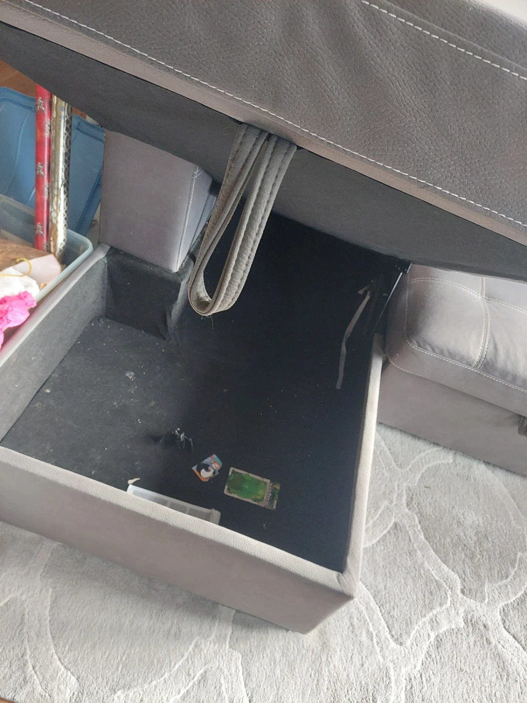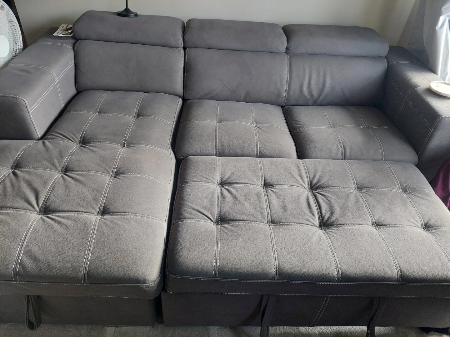 Selling a grey sectional sofa. It has some wear and tear on the handle, as shown in the pictures. The sofa includes storage space under the one section