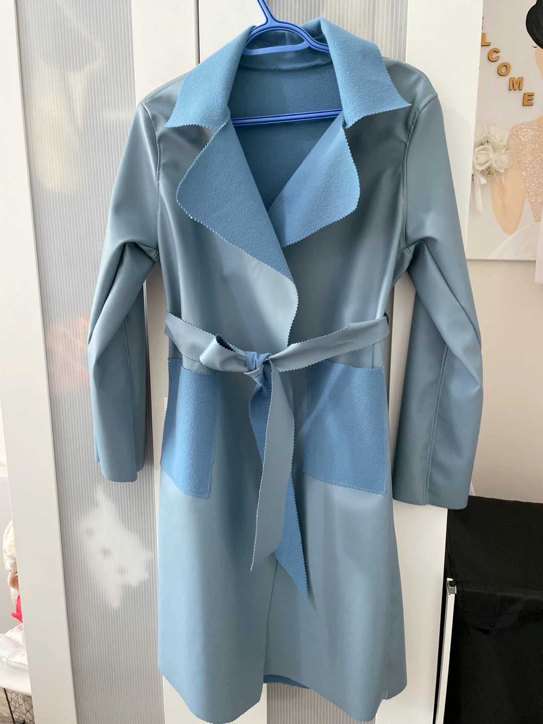Here's a stylish belted trench coat in a lovely shade of blue! It's in great condition and ready to keep you looking chic on those cooler days