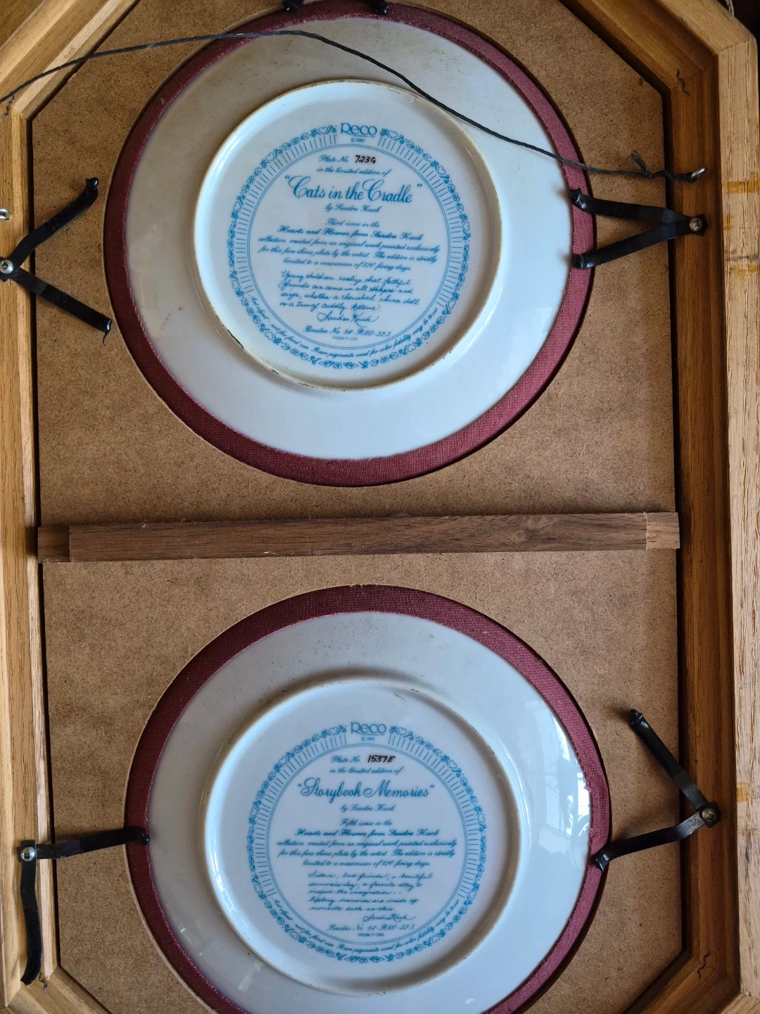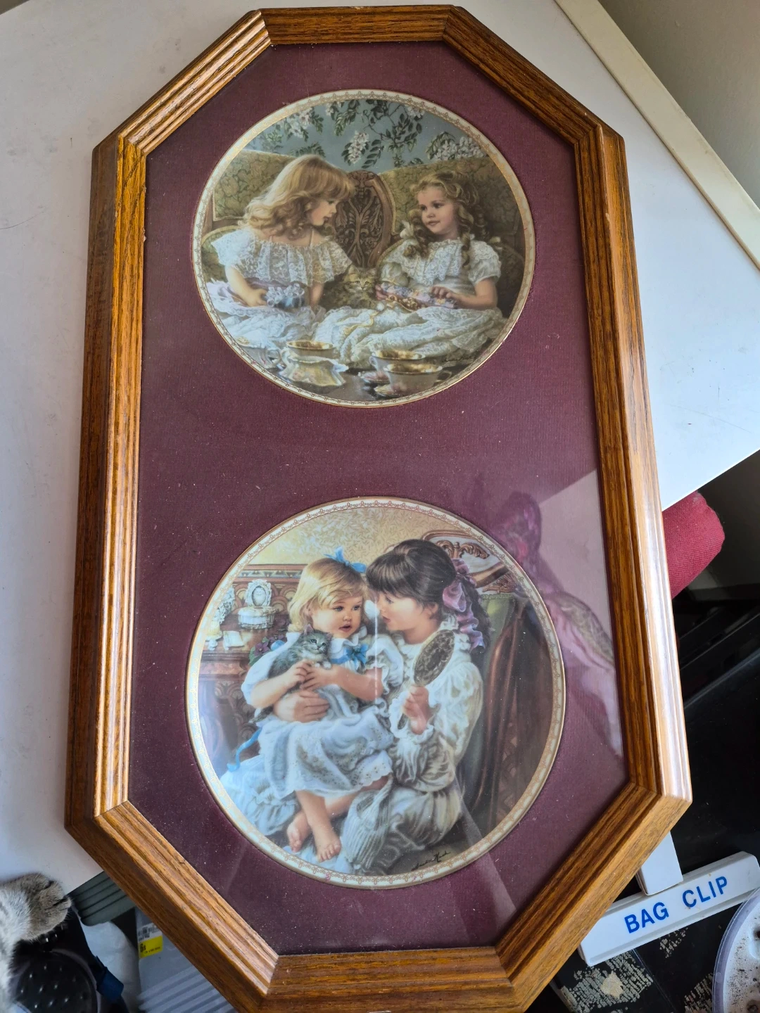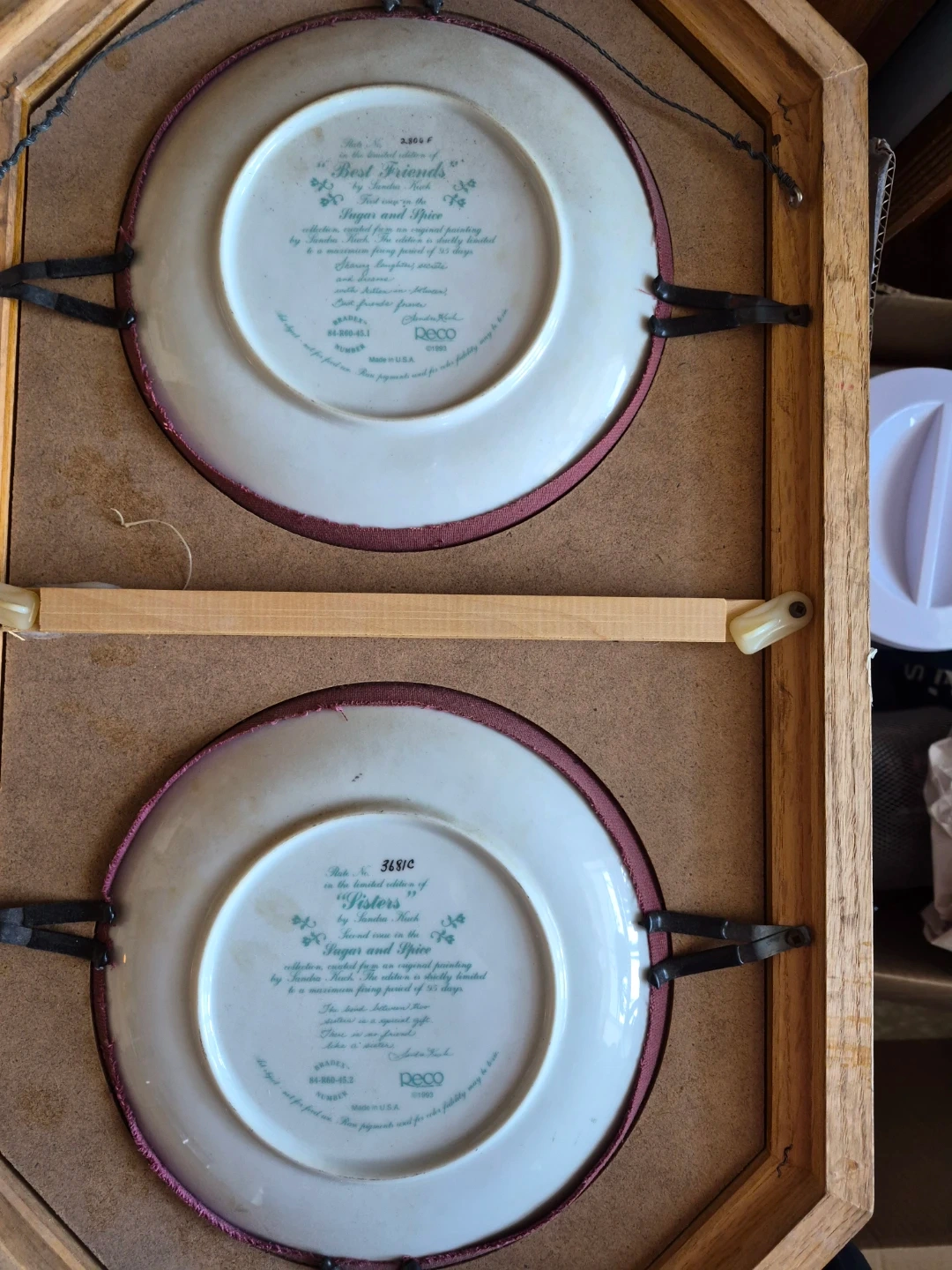 Selling a framed set of Deco collector plates. The top plate is "Best Friends" and the bottom plate is "Sisters". The plates are part of a limited edition collection. They are framed in a wooden frame with a burgundy matting. $35.00 for each set or $60 for both