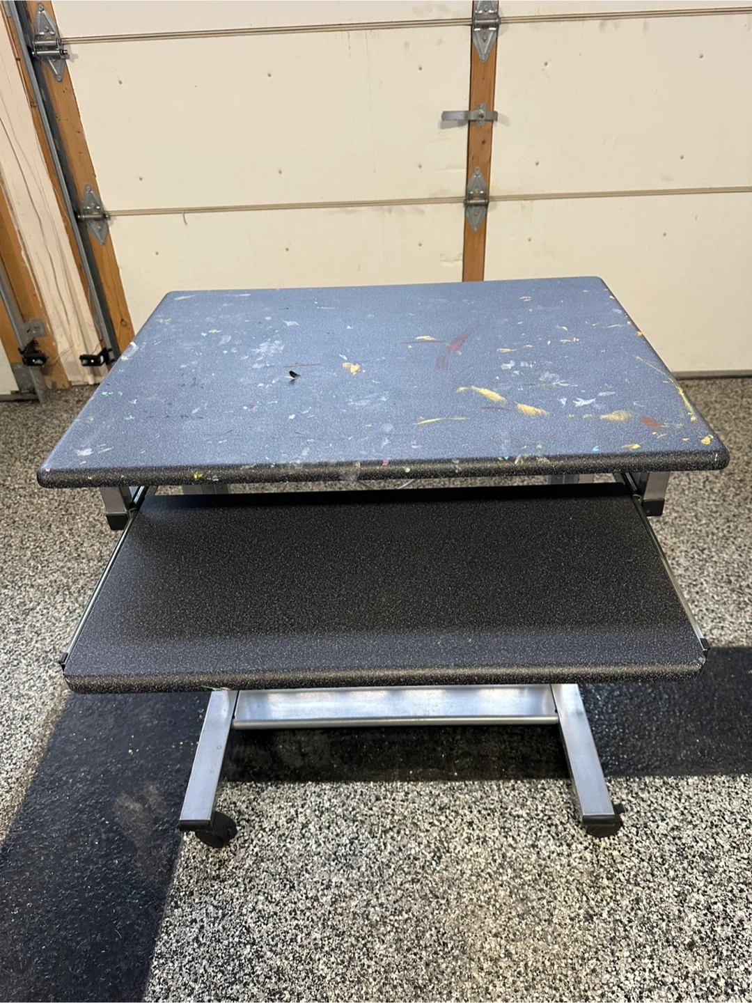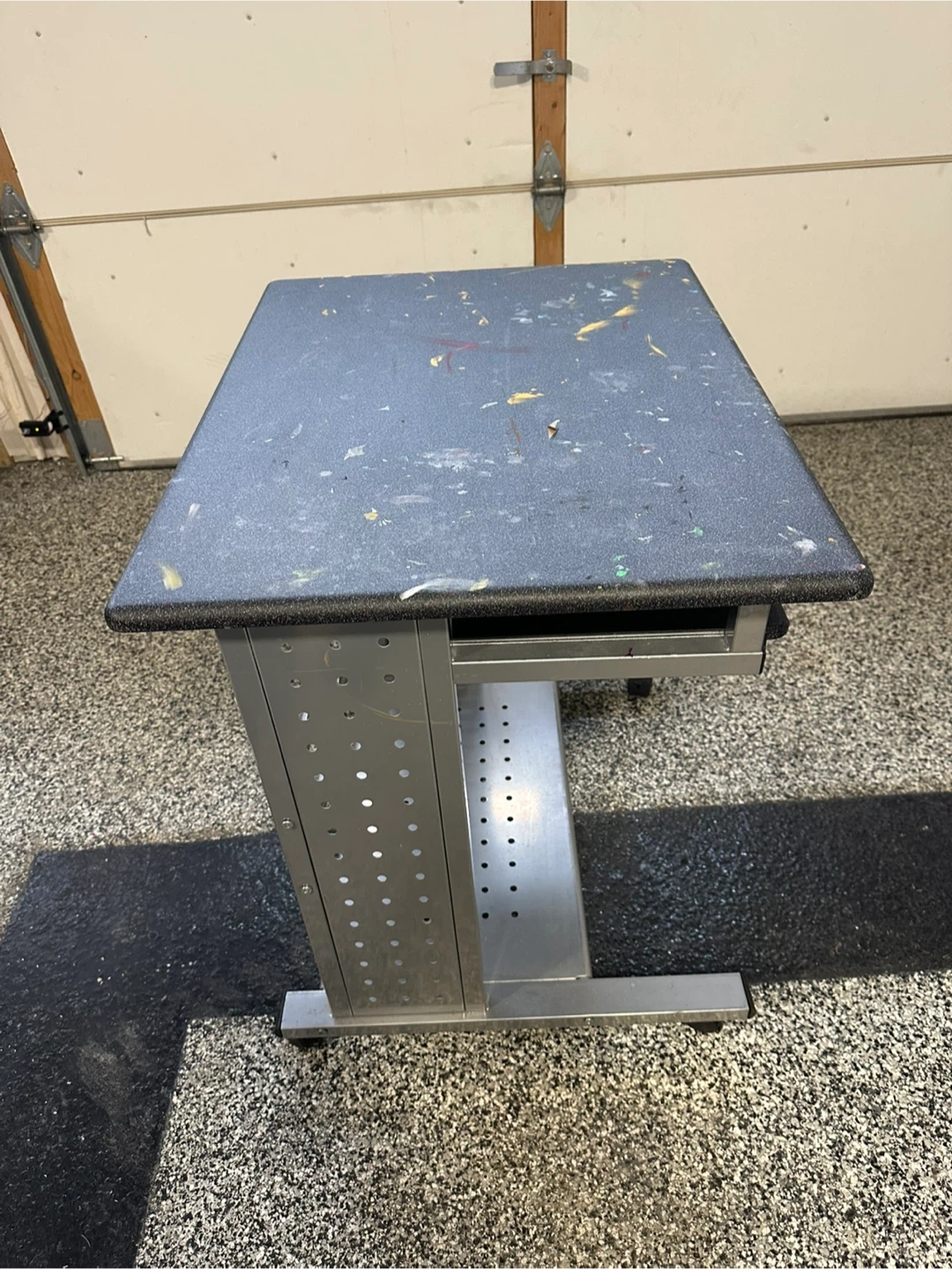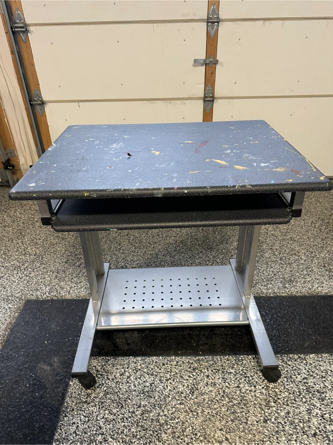 Sturdy, well-used workbench — perfect as a artist’s desk or converted into a reliable computer/DIY workstation. Heavy-duty metal frame, durable paint-splattered top, and locking wheels for easy moving and secure placement. Ideal for hobbyists, makers, or anyone who needs a tough, mobile desk. Come pick it up and bring it home today.