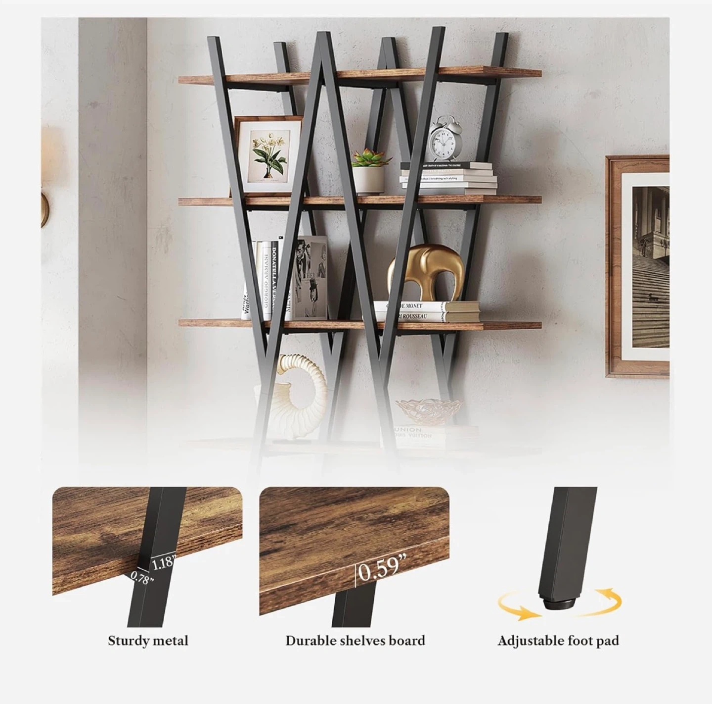 This ladder shelf bookshelf features a sturdy metal frame and durable shelves. It has adjustable foot pads for stability. The dimensions are approximately 74.8" tall, 39.37" wide, and 11.81" deep. The shelves are about 12.59" apart. Great for adding a rustic touch to your home!