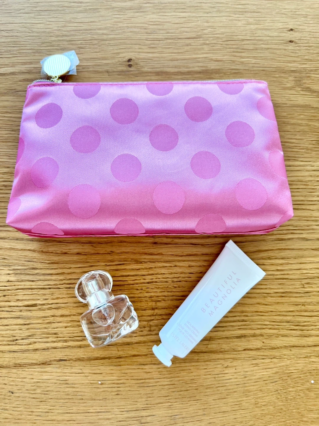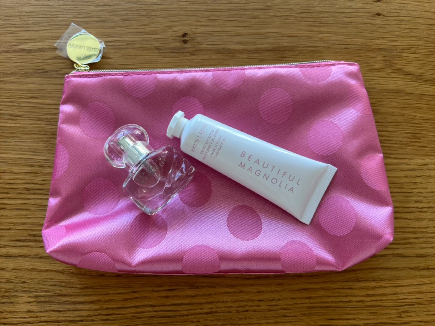 Selling Estée Lauder Beautiful Magnolia set! It includes a small perfume, hand cream, and a pink polka dot pouch.
