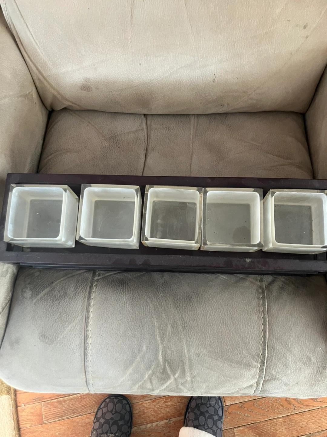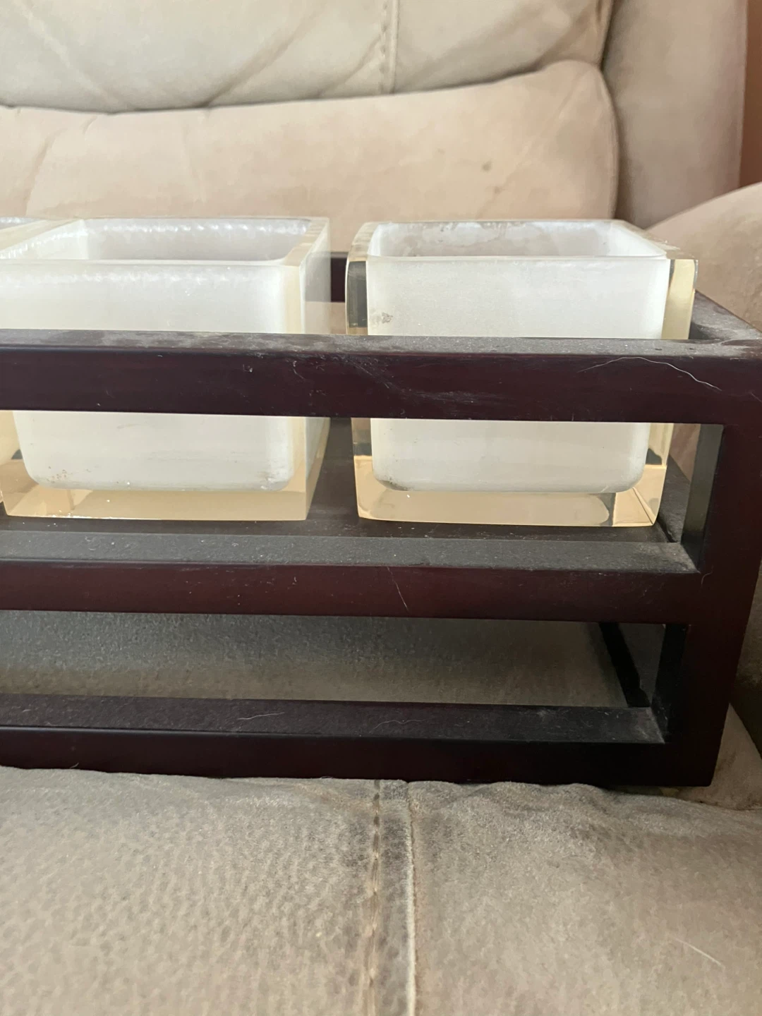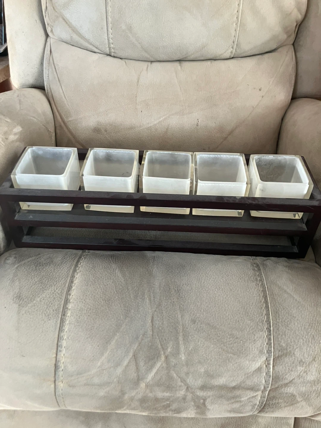 Selling a decorative tray with 5 frosted glass containers/candleholders in a dark wood frame, approx 17”x 6”. It's in great condition and would look great on a coffee table or bookshelf!