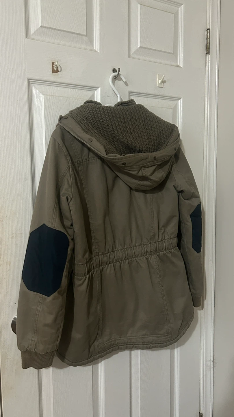 Selling a Defacto jacket in olive greenish beige. It's a size M and features a hood and drawstring waist. Perfect for cool weather! Cottage vibe!