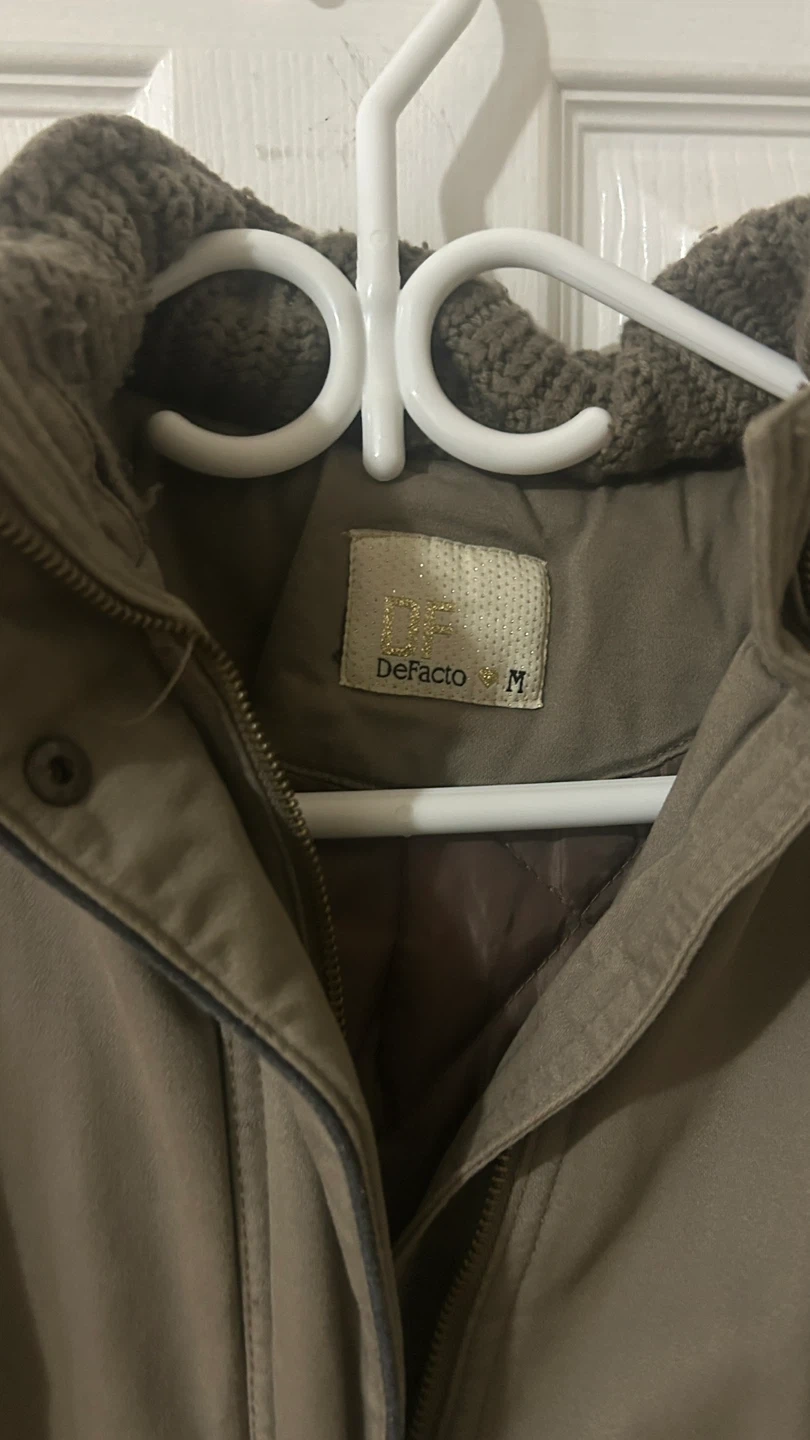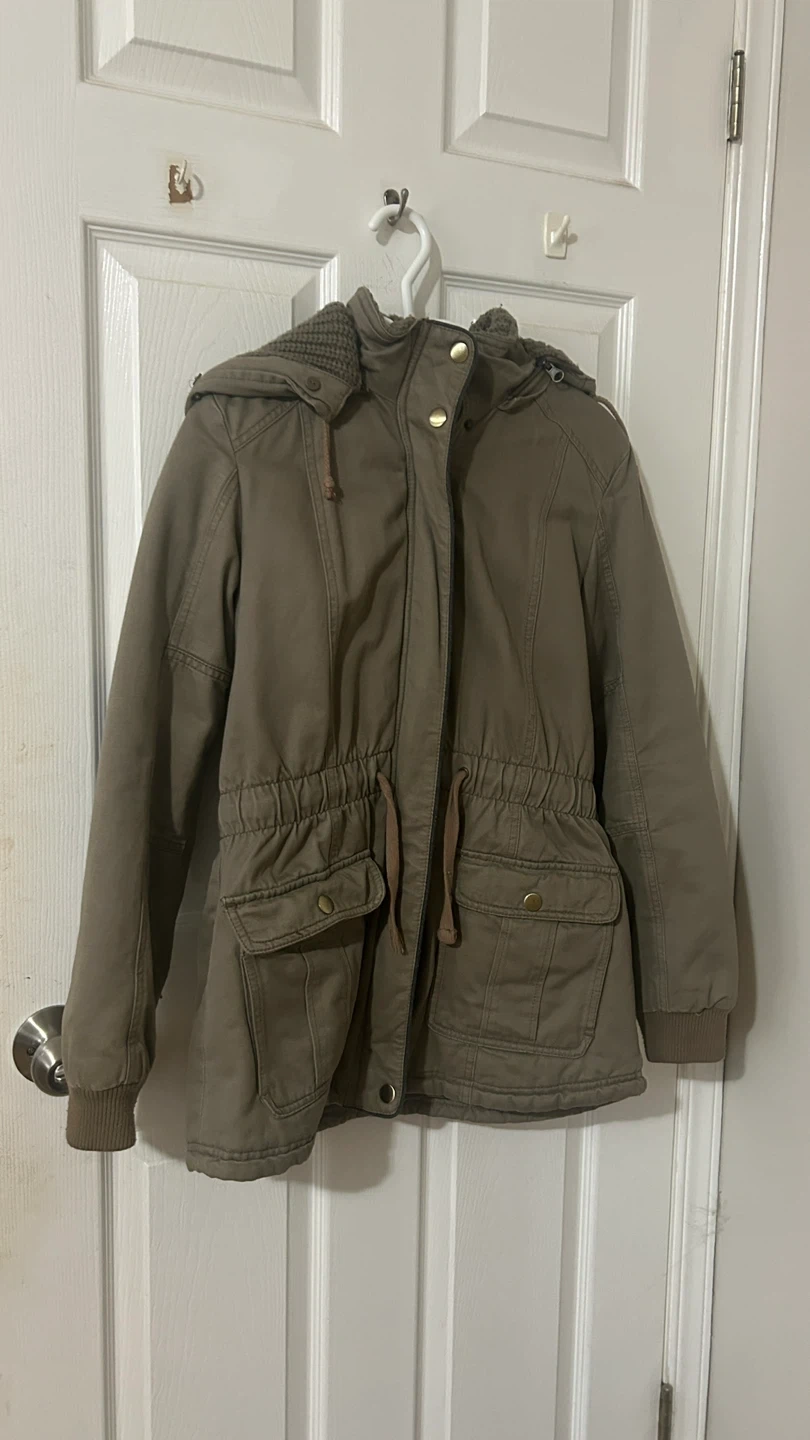 Selling a Defacto jacket in olive greenish beige. It's a size M and features a hood and drawstring waist. Perfect for cool weather! Cottage vibe!