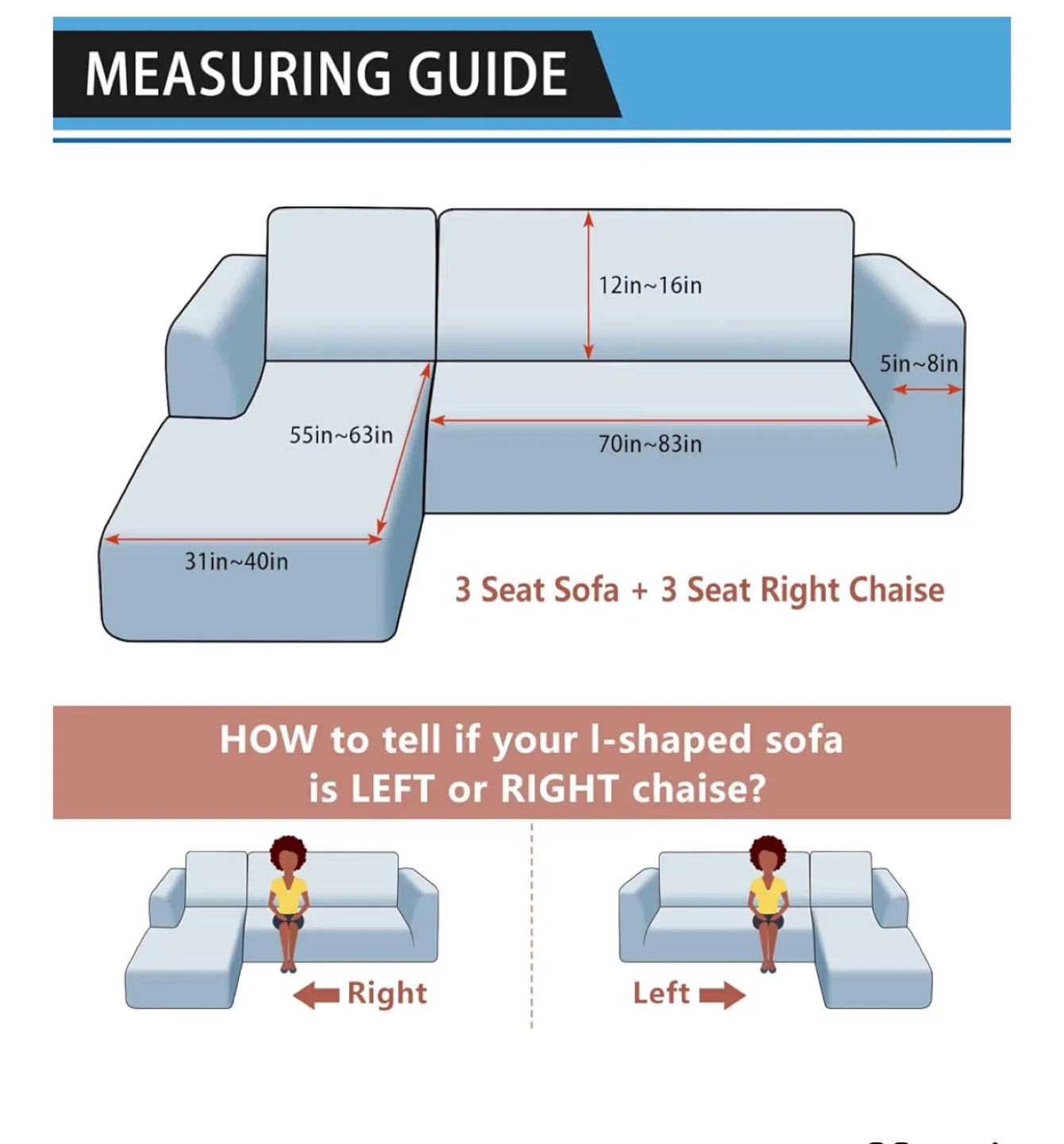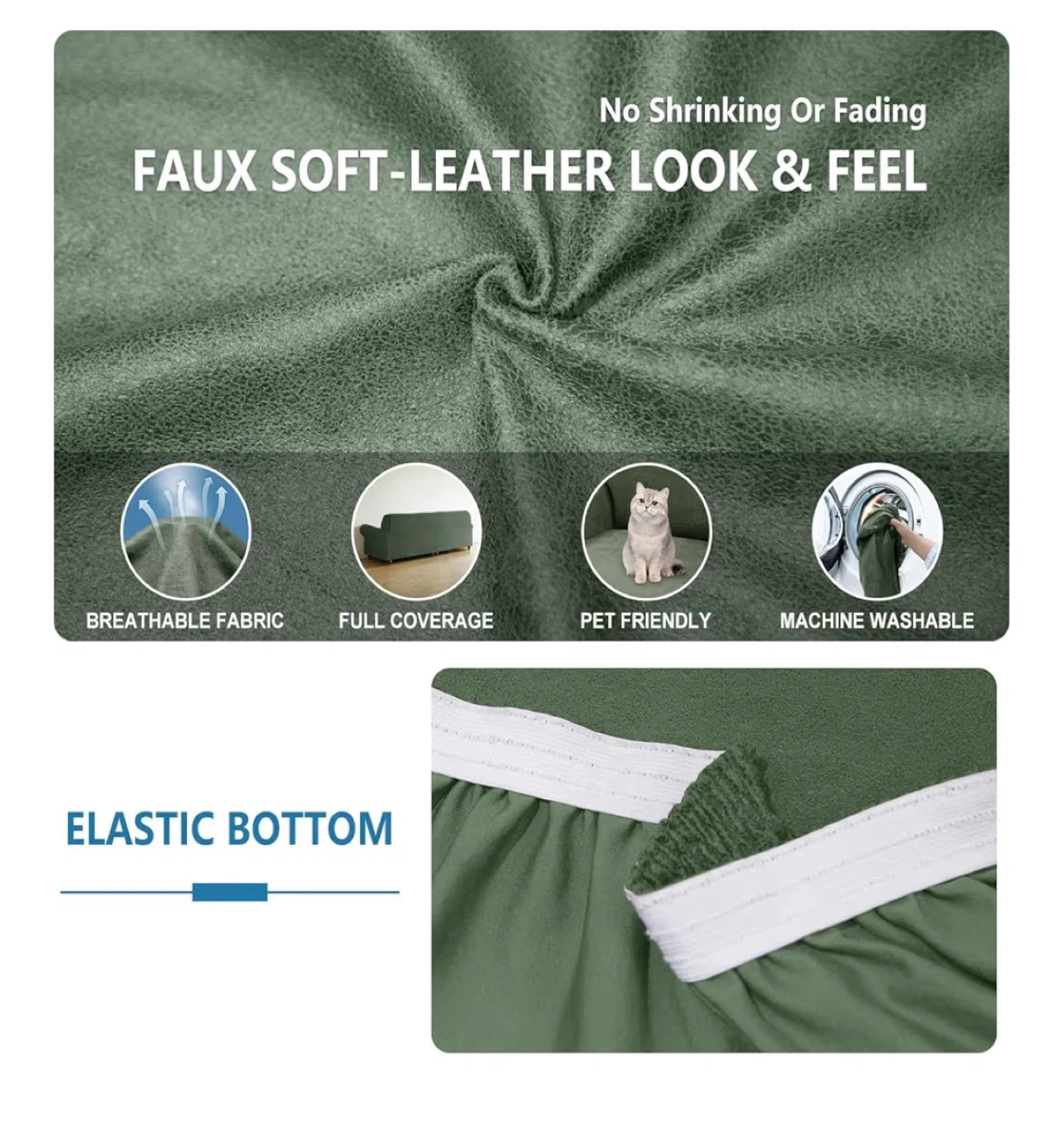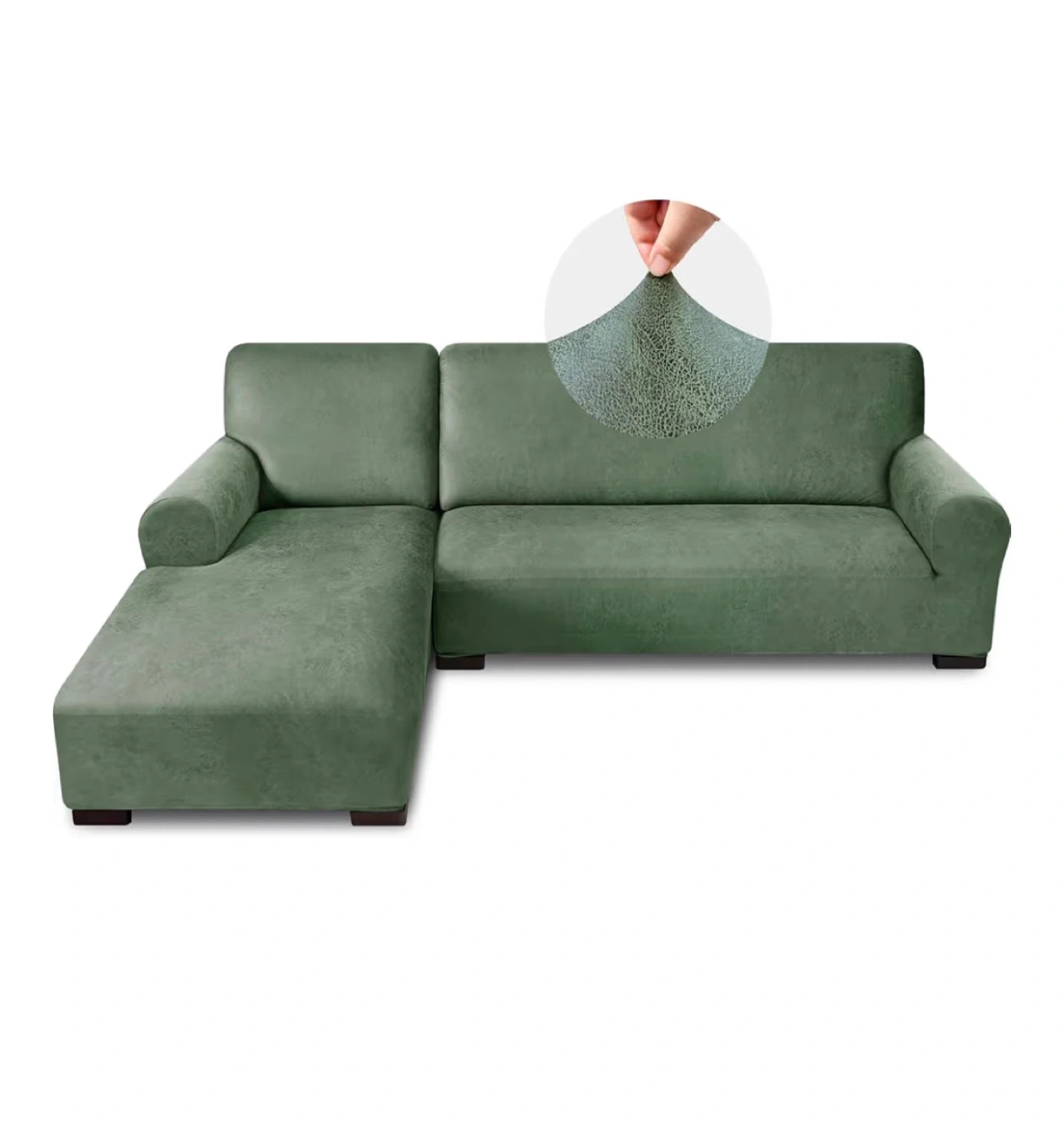 This green sofa cover has a faux soft-leather look and feel! It's designed to be breathable, provide full coverage, and is pet friendly and machine washable. It features an elastic bottom and is designed to fit a 3-seat sofa with a 3-seat right chaise. The measuring guide shows the dimensions to ensure a great fit!
