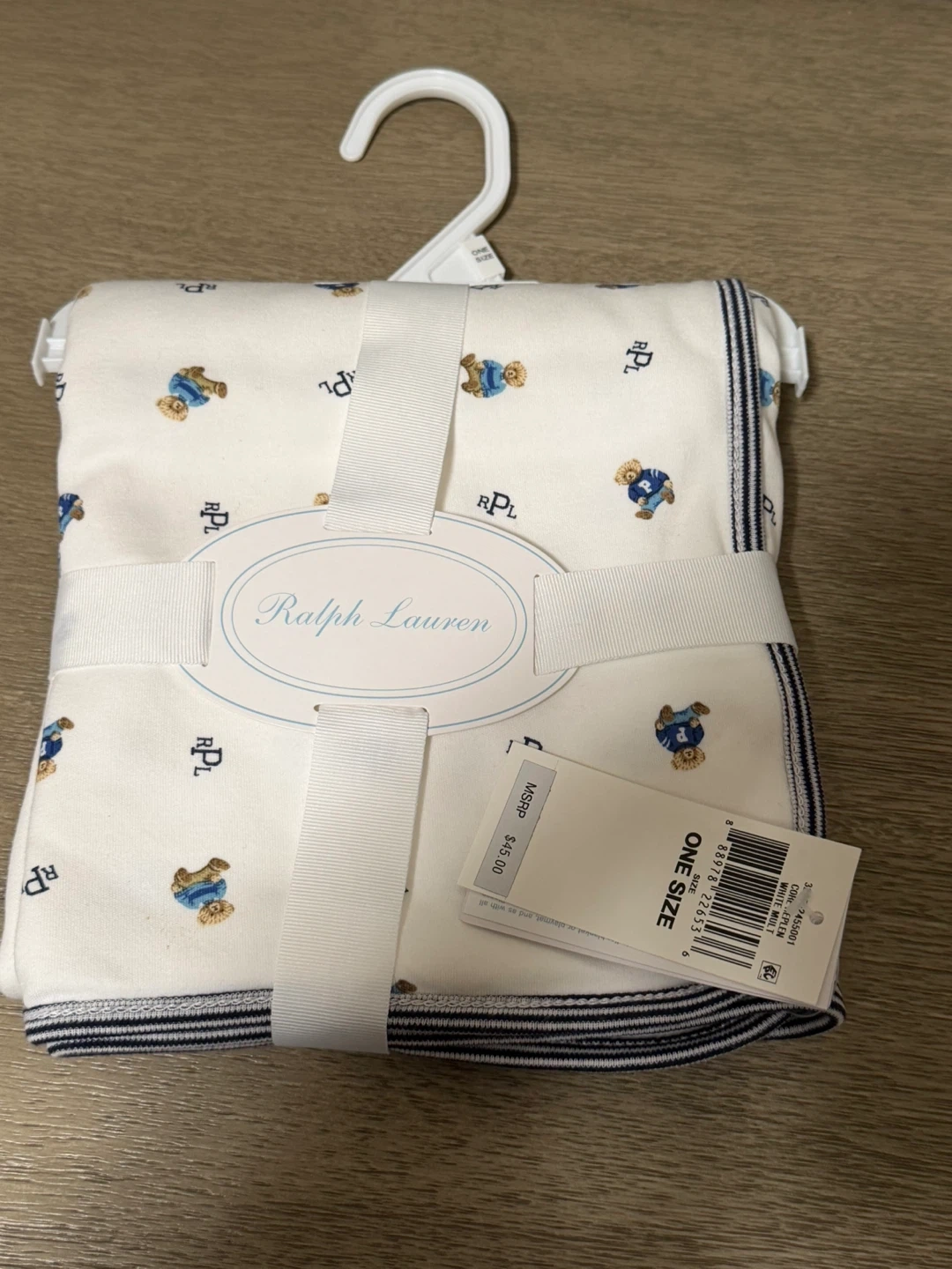 This is a brand new Ralph Lauren baby blanket! It features the iconic Polo Bear design on a soft, white background. The blanket is trimmed with a navy blue and white striped border. It's a one-size item and still has the original tag attached. Originally bought for $45.99