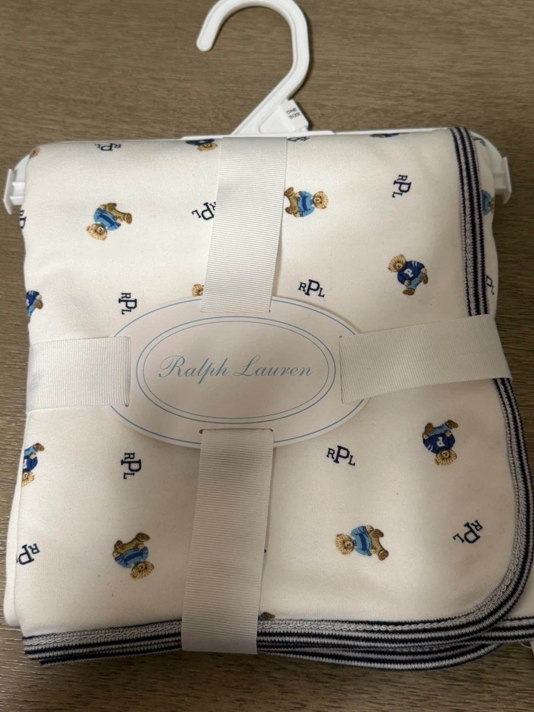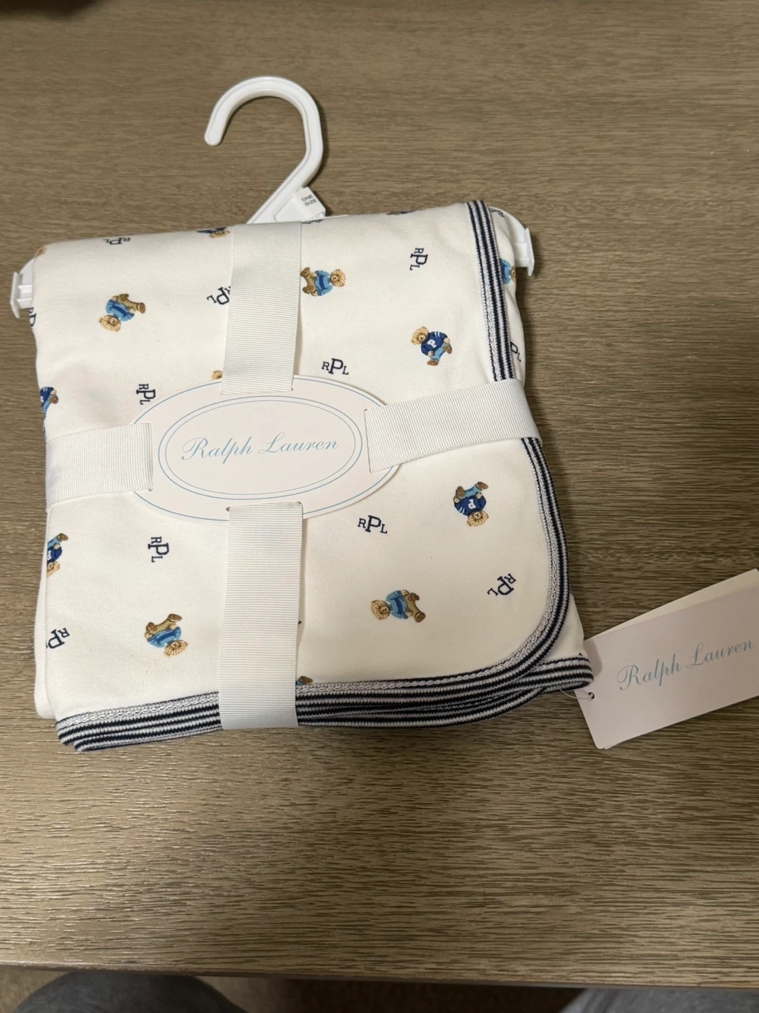 This is a brand new Ralph Lauren baby blanket! It features the iconic Polo Bear design on a soft, white background. The blanket is trimmed with a navy blue and white striped border. It's a one-size item and still has the original tag attached. Originally bought for $45.99