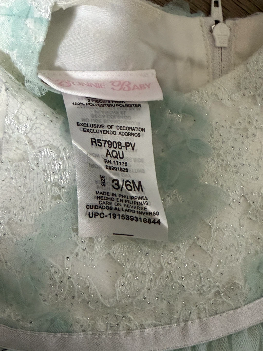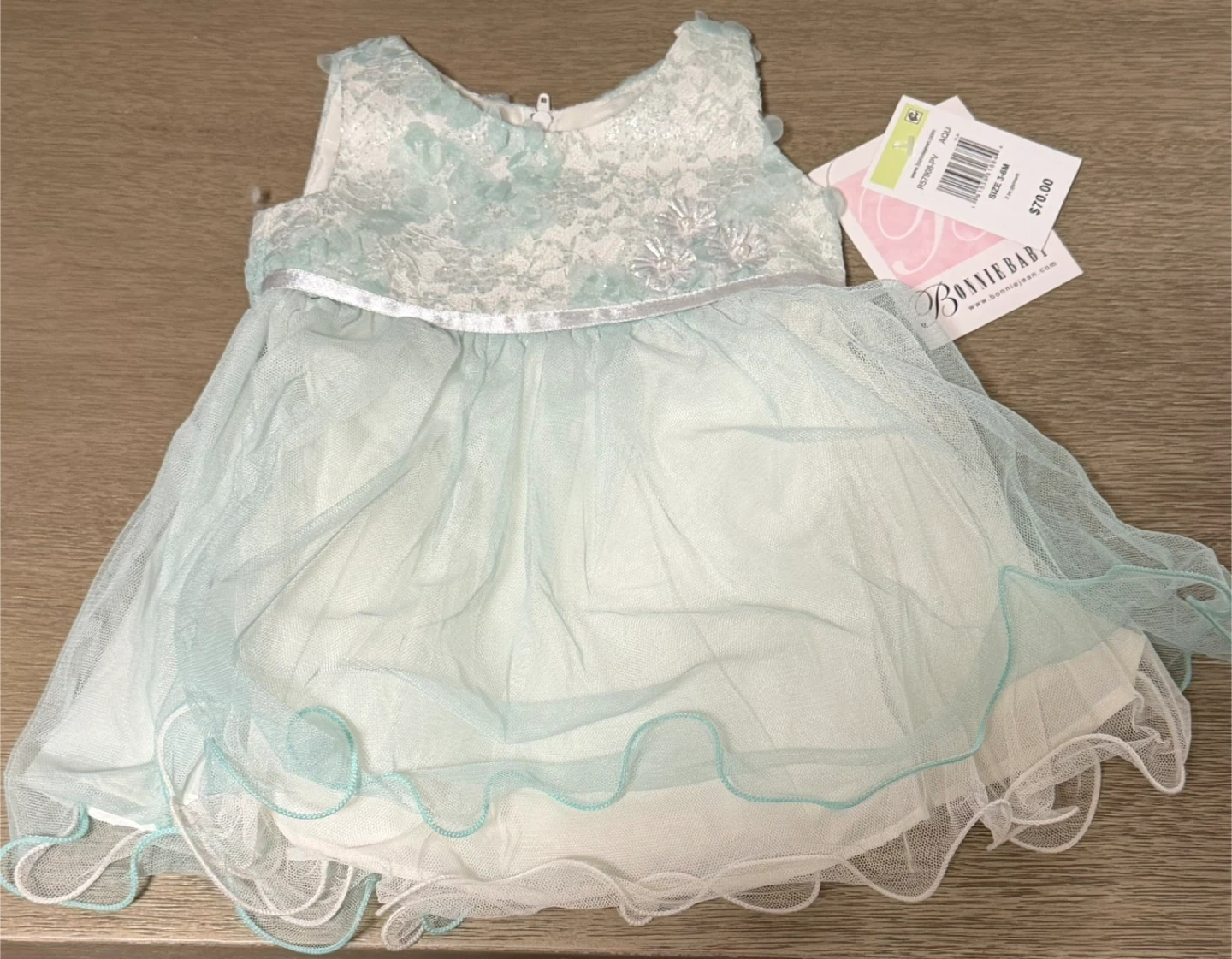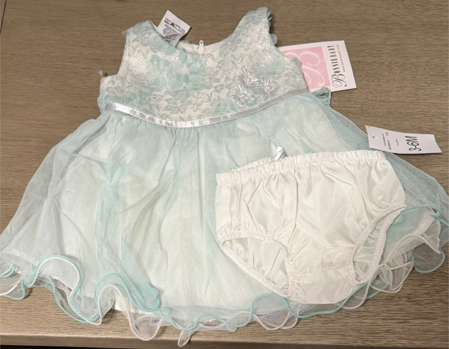 I'm selling a Bonnie Baby dress in size 3/6M. It's a beautiful dress made of 100% polyester. It comes with matching bloomers. The dress features a lovely design with delicate details. Originally priced at $70.00, it's a great deal!