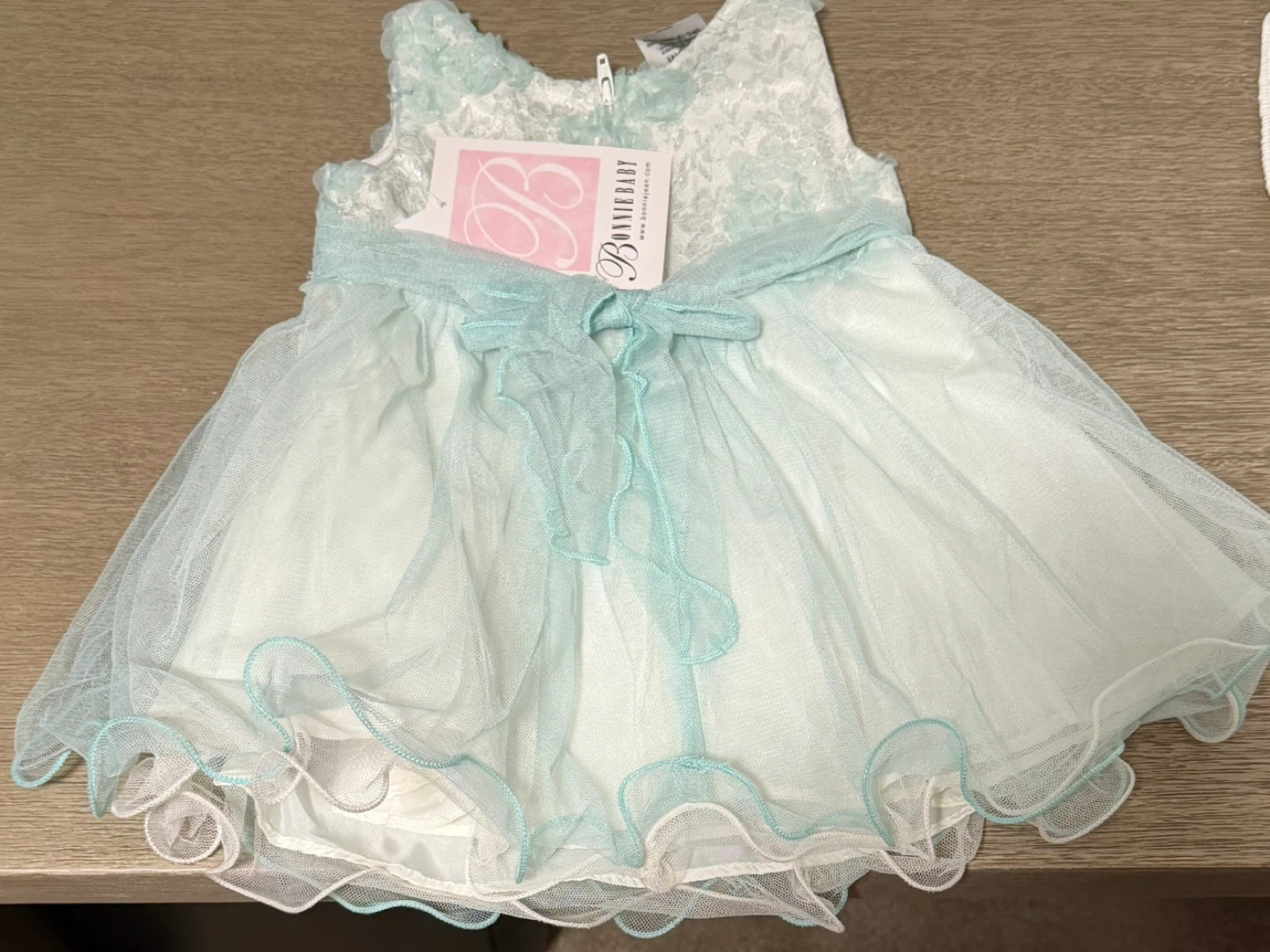 I'm selling a Bonnie Baby dress in size 3/6M. It's a beautiful dress made of 100% polyester. It comes with matching bloomers. The dress features a lovely design with delicate details. Originally priced at $70.00, it's a great deal!