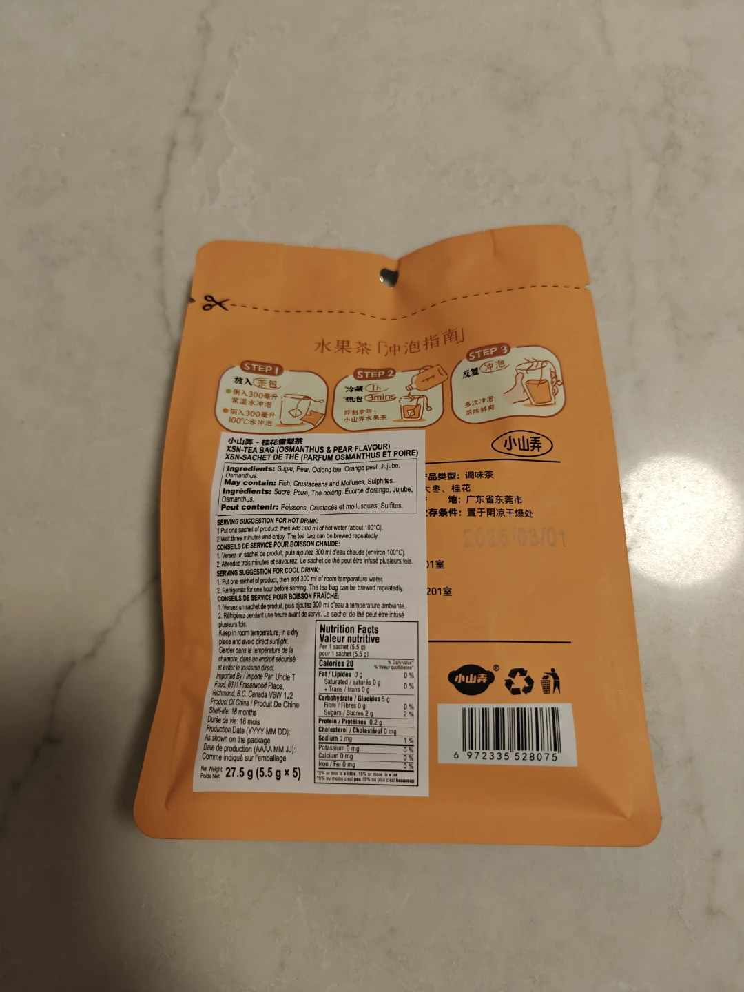 Selling Xiaoshan Guihua Xueli Cha, a delightful blend of osmanthus and pear flavours! Each package contains 27.5g (5 x 5.5g) of tea bags. The production date is 2025 March 01