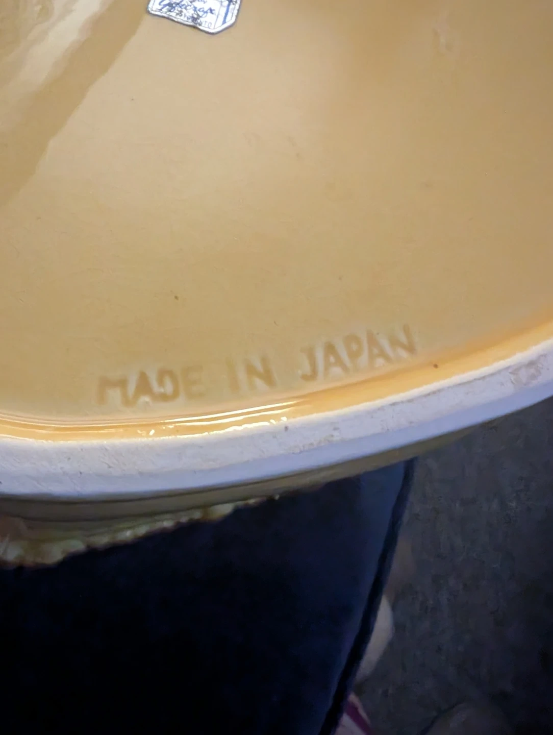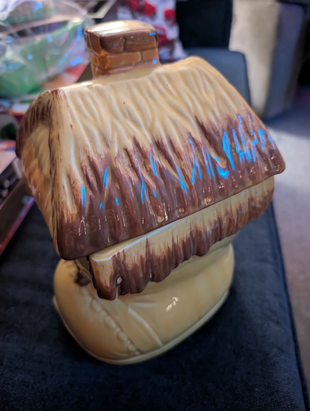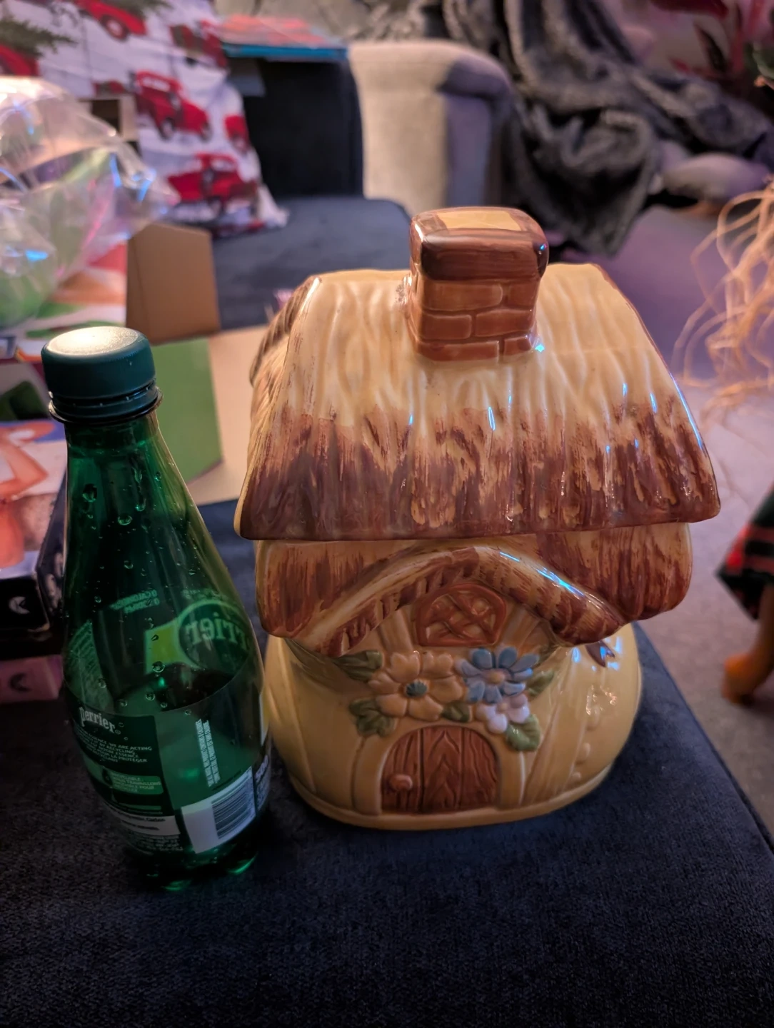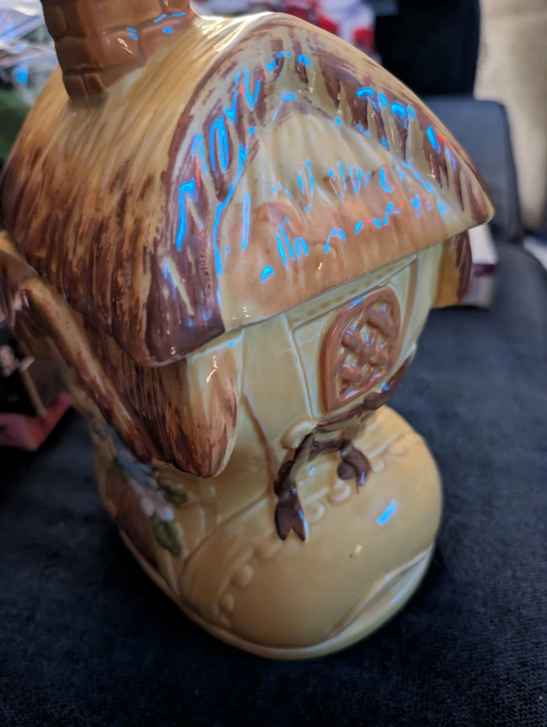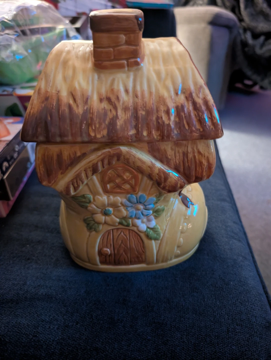 Here's a charming vintage cookie jar shaped like a cottage! It's made in Japan and has a lovely, detailed design. Perfect for adding a touch of whimsy to your kitchen or as a unique decorative piece
