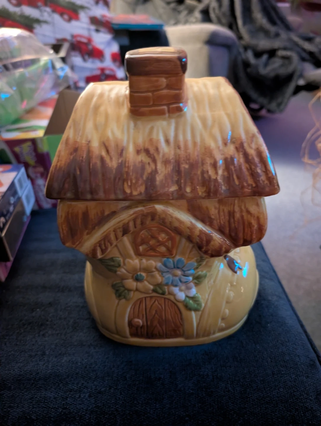 Here's a charming vintage cookie jar shaped like a cottage! It's made in Japan and has a lovely, detailed design. Perfect for adding a touch of whimsy to your kitchen or as a unique decorative piece