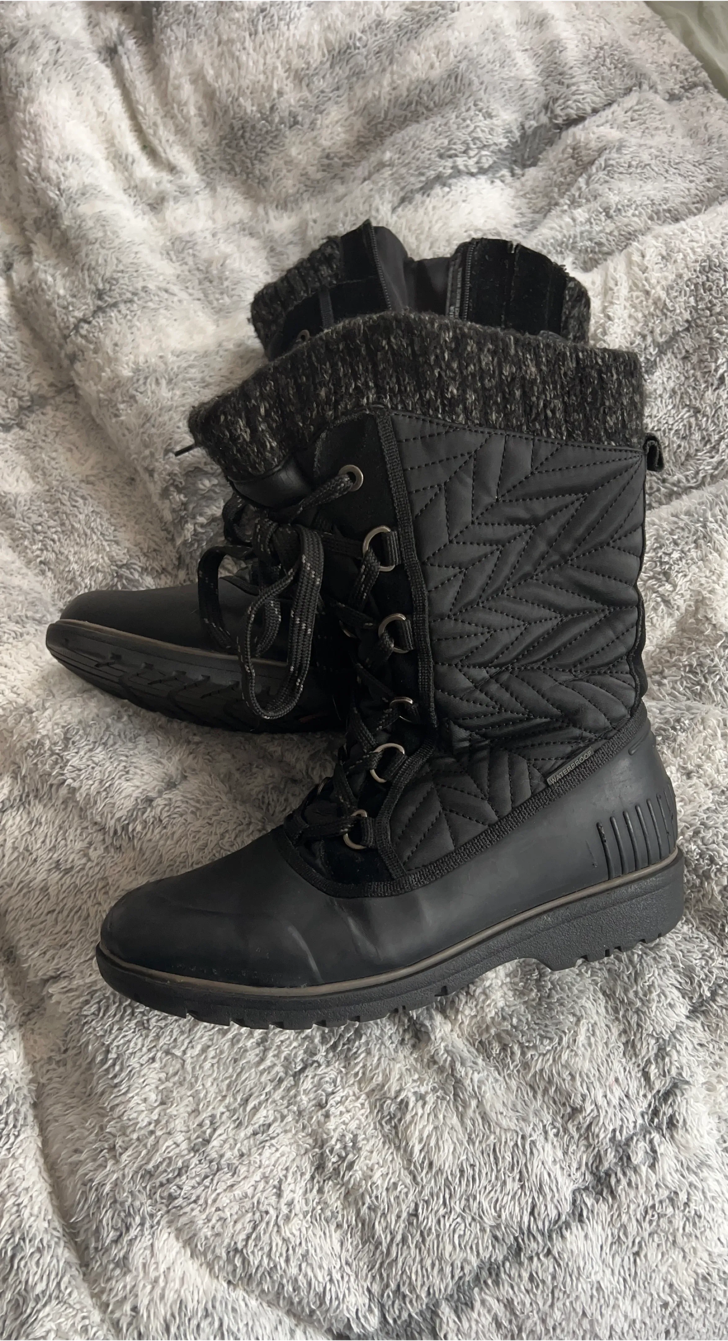 These are a pair of black winter boots with a knit cuff detail. They appear to be in good condition and ready to keep your feet warm and stylish this winter