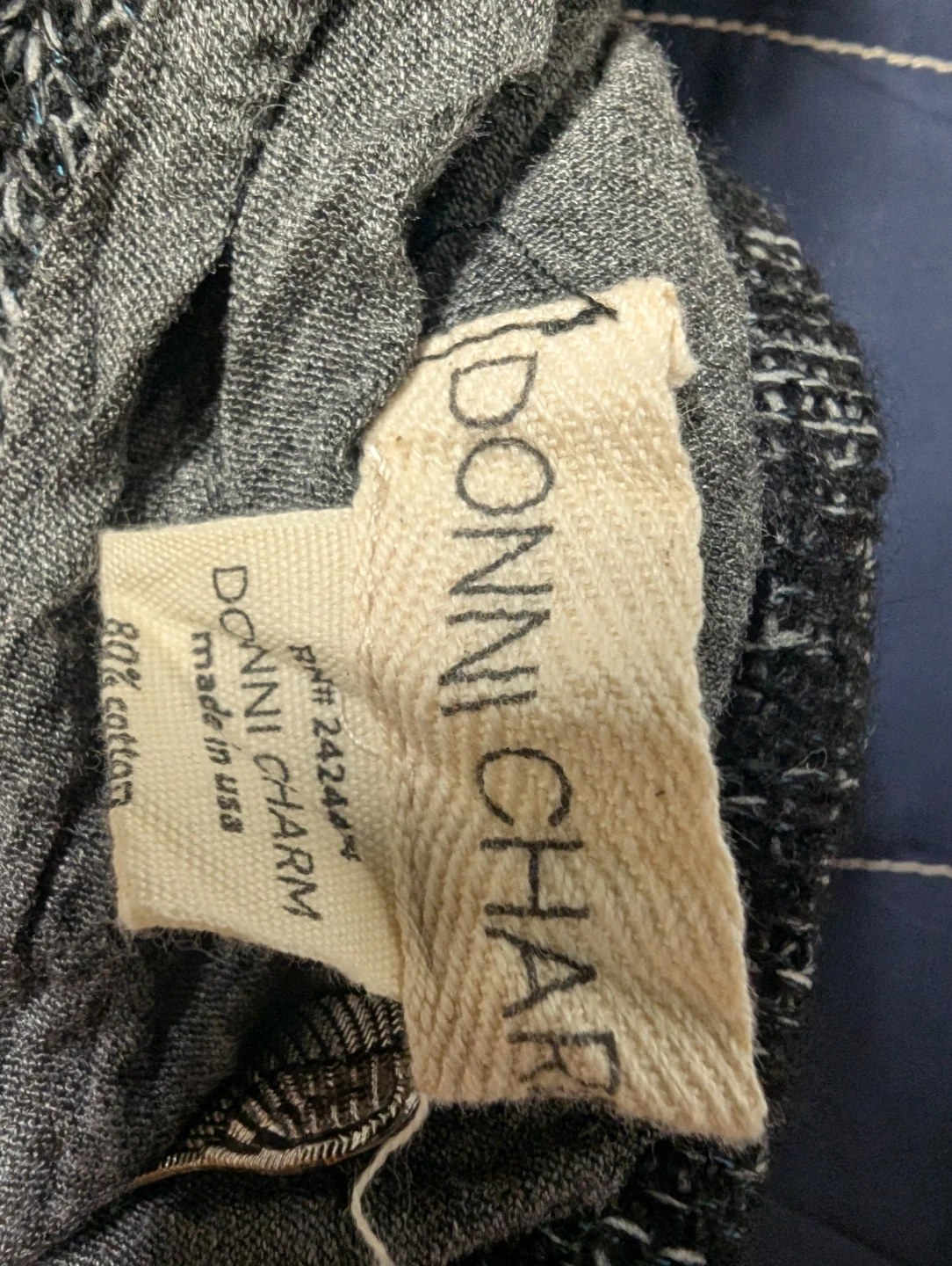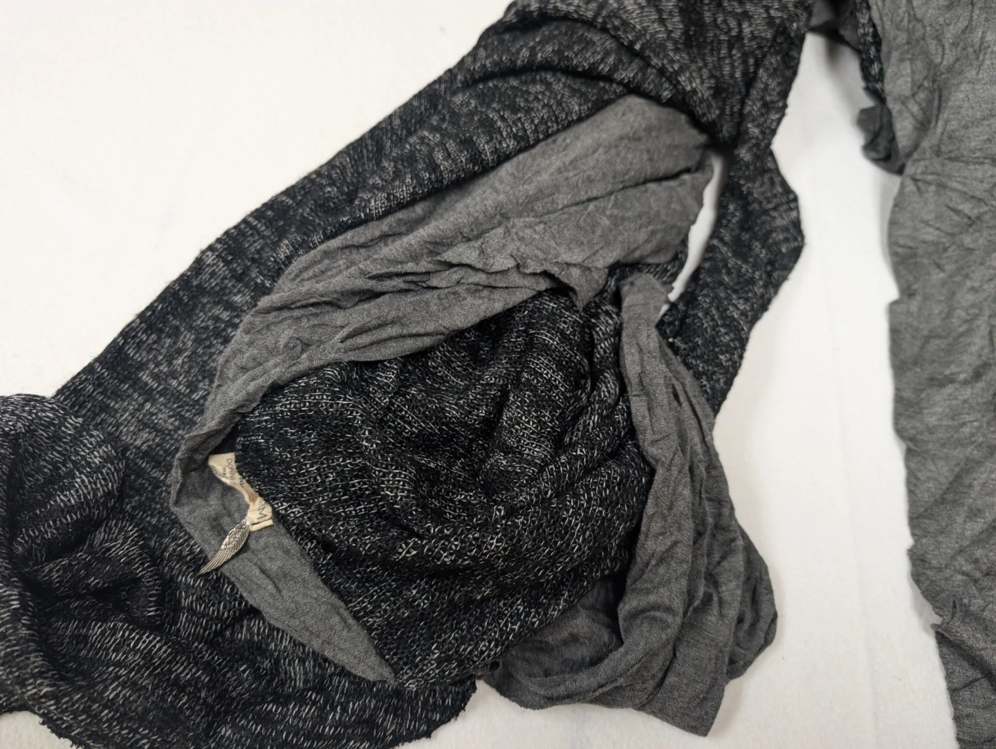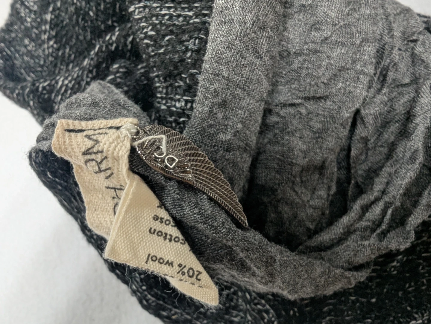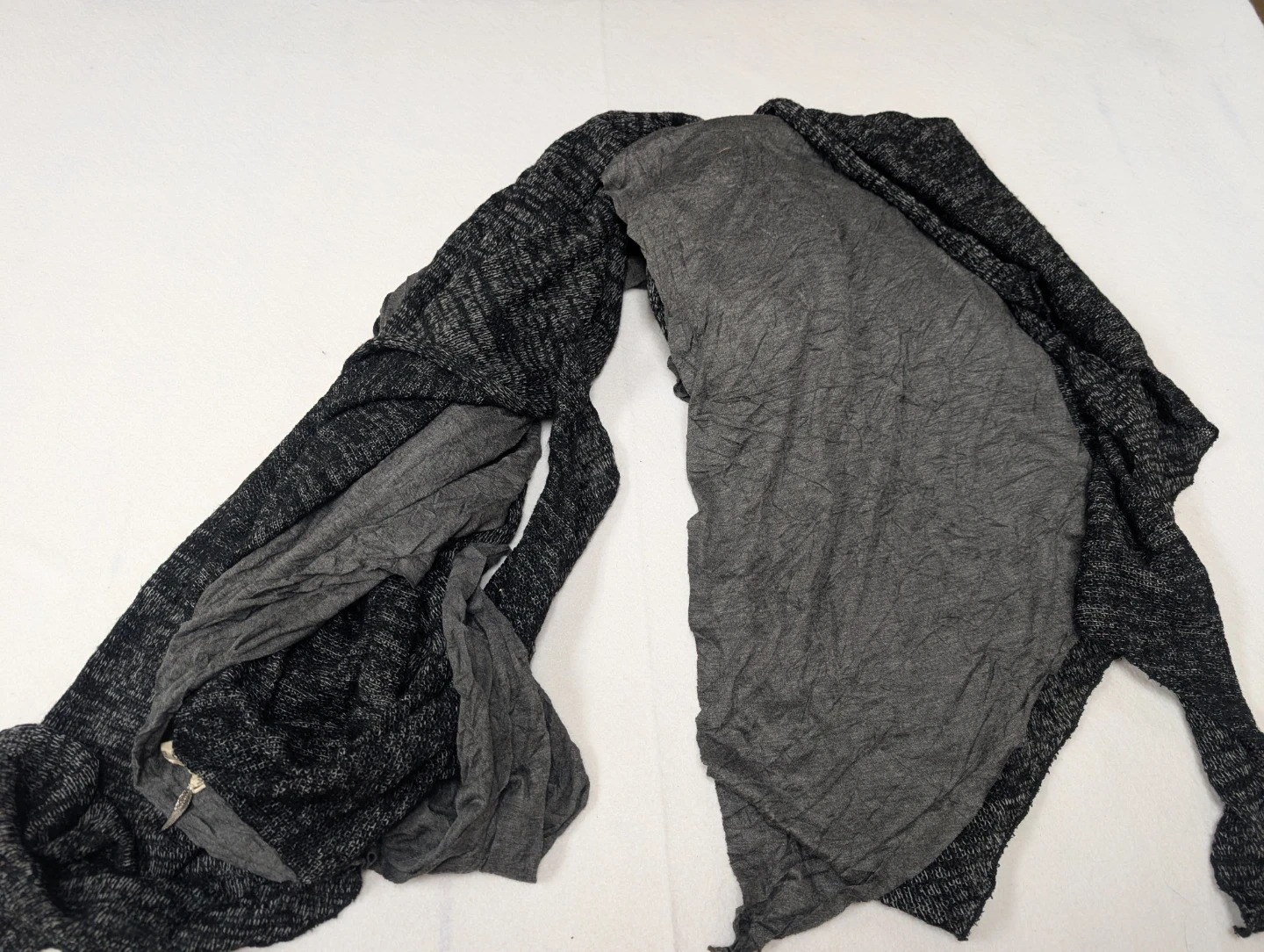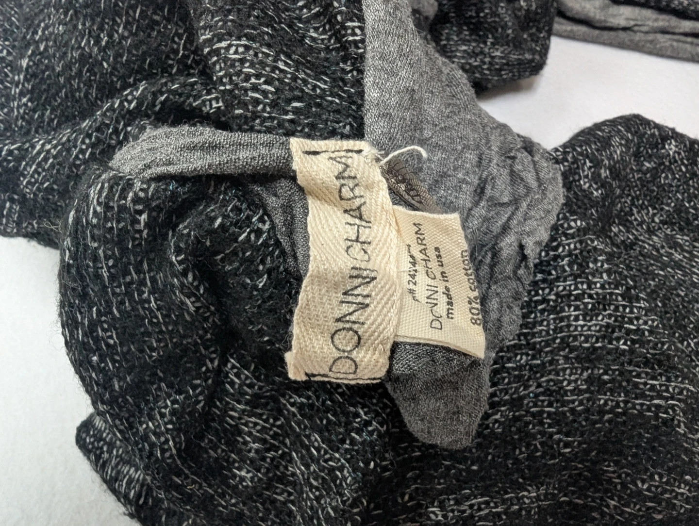 Selling a DONNI.CHARM scarf in a mix of grey tones! It's made of 80% cotton and 20% wool, making it a cozy and stylish accessory for any outfit