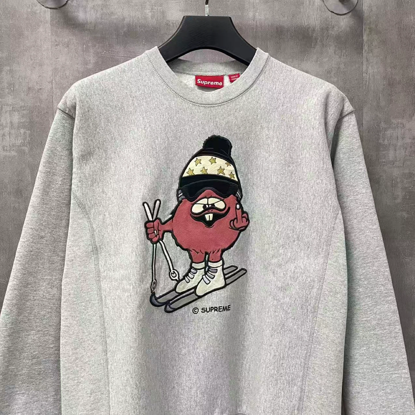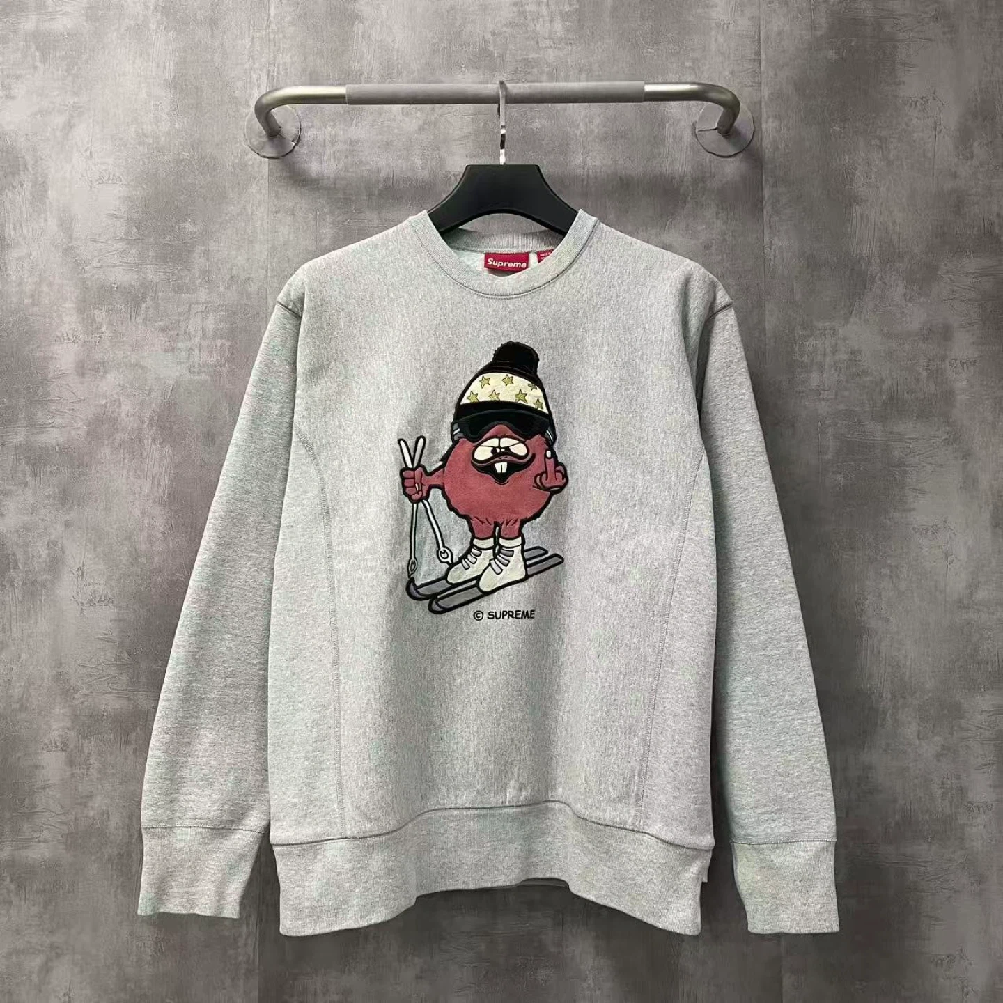 Selling a Supreme grey crewneck sweatshirt! It features a unique graphic design. This stylish sweatshirt is perfect for casual wear and showing off your streetwear style