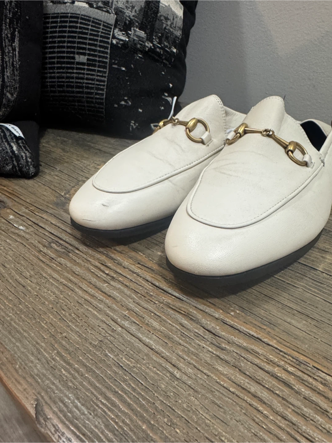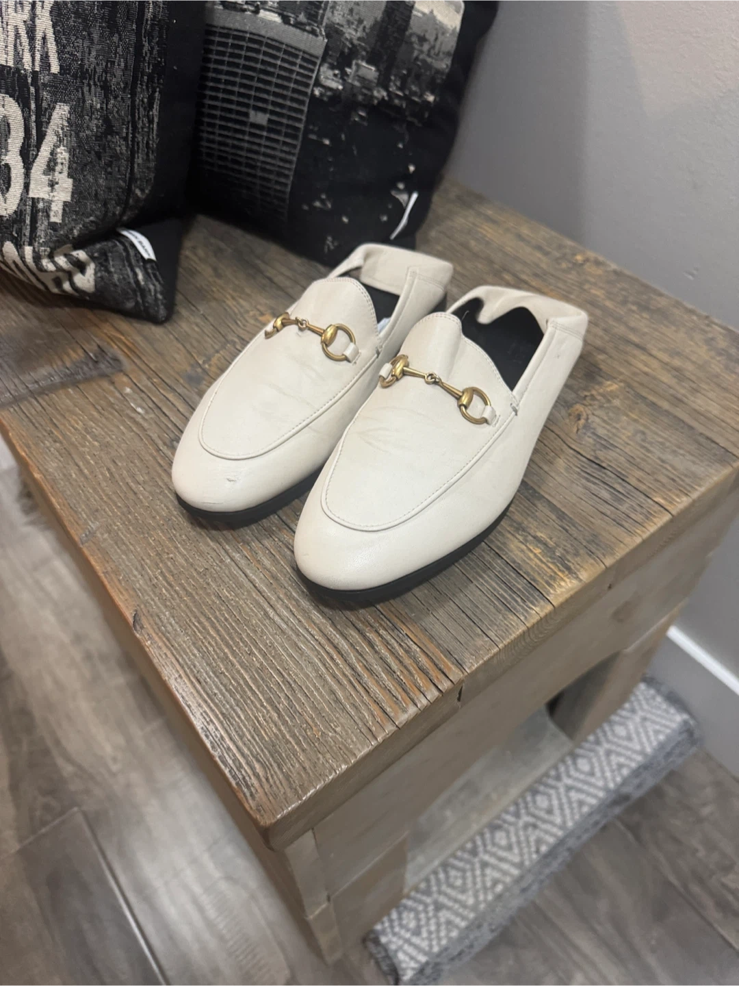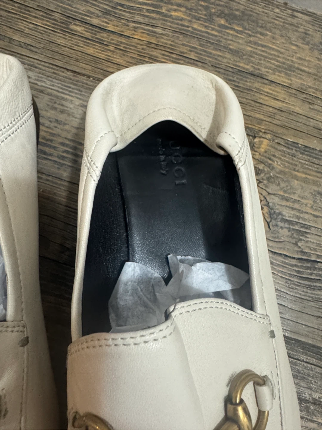 Step out in style with these sleek womens white loafers, featuring a sophisticated gold accent. Perfect for any occasion. As is scuffs to toes from wear & creasing. No box or dust bag. Can provide alternative 1 dustbag