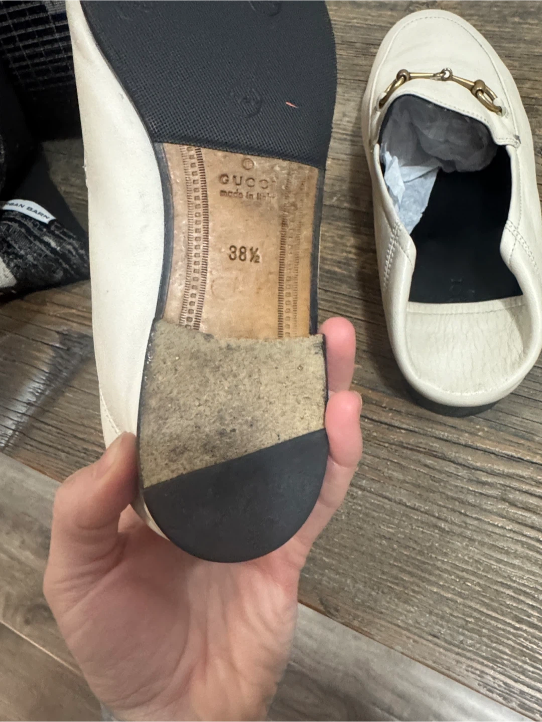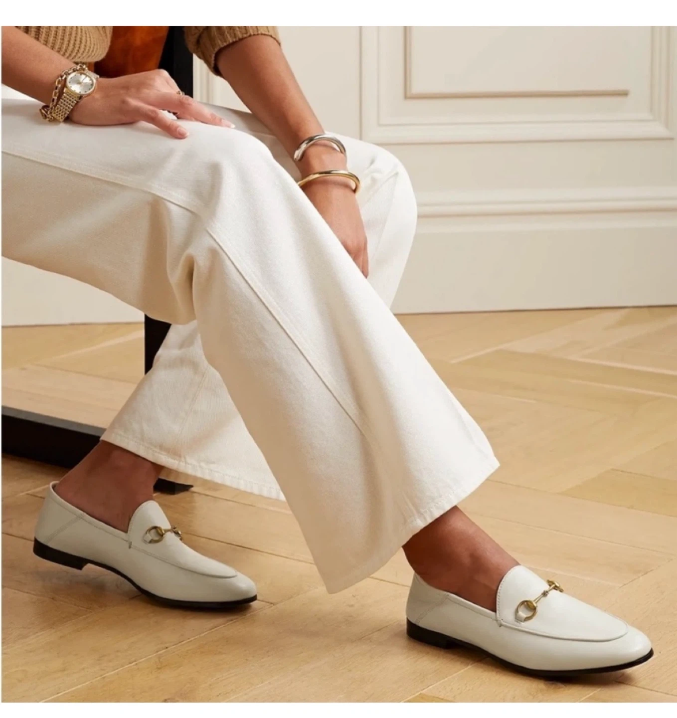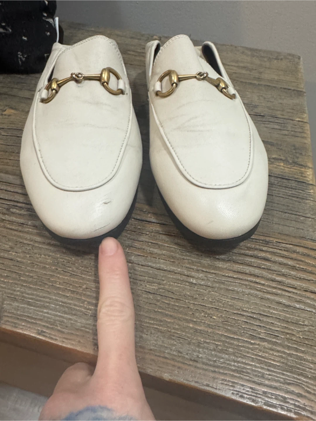 Step out in style with these sleek womens white loafers, featuring a sophisticated gold accent. Perfect for any occasion. As is scuffs to toes from wear & creasing. No box or dust bag. Can provide alternative 1 dustbag